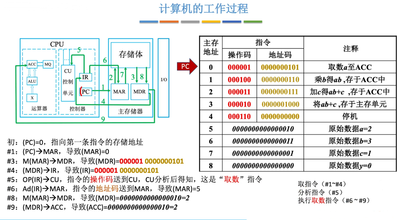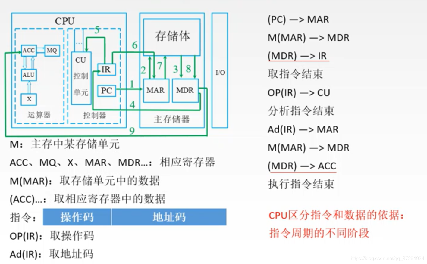 上图是计算机的工作流程,首先 PC 将指令地址发送给 MAR,MAR 根据地址在存储体中找到指令数据存放在 MDR 中,之后 MDR 将指令存放在 IR 中,取指令结束,之后指令中的操作码进入 CU 中,地址码重复上述取指令步骤,将数据发送到 ACC 中,执行指令结束。注意区分指令和数据的依据: 指令周期的不同阶段