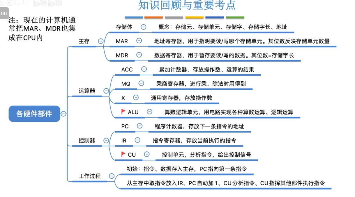 IR 存放当下欲执行的指令;PC 存放下一条指令的地址; MAR 存放欲访问的存储单元地址;MDR 存放从存储单元取来的数据! 地址译码器是主存的构成部分,不属于 CPU;地址寄存器虽然一般属于主存,但是现代计算机中绝大多数 CPU 内集成了地址寄存器! 关于 CPU 存取速度的比较:寄存器(CPU 内部)> Cache(高速的 SRAM) > 内存 (SDRAM)