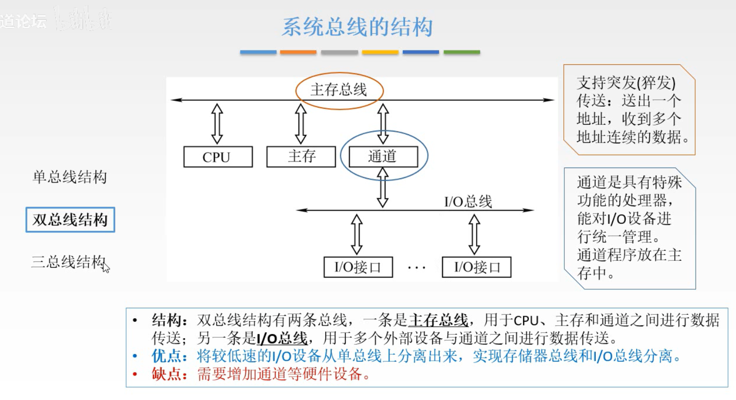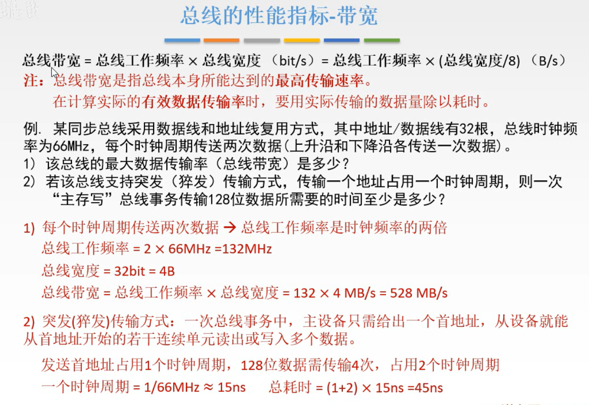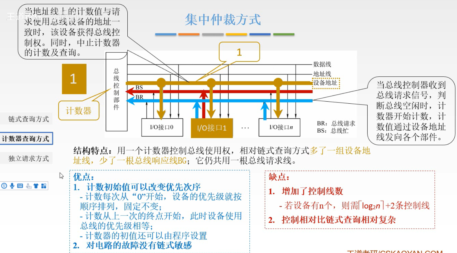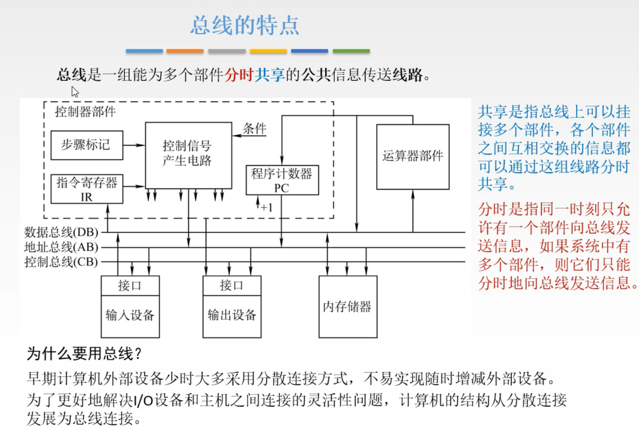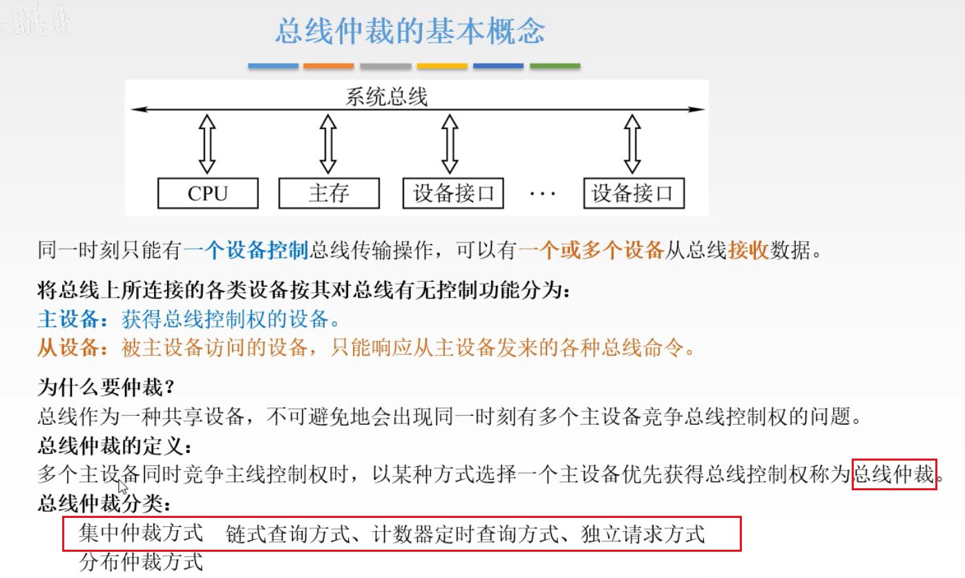 1. 引入总线会导致什么问题?如何解决? 引入总线后,总线上的各个设备分时共享同一总线,当总线上多个设备同时要求使用总线时就会导致总线的冲突。为解决多个主设备同时竞争总线控制权的问题,应当采用总线仲裁部件,以某种方式选择一个主设备优先获得总线控制权,只有获得了总线控制权的设备才能开始数据传送。
