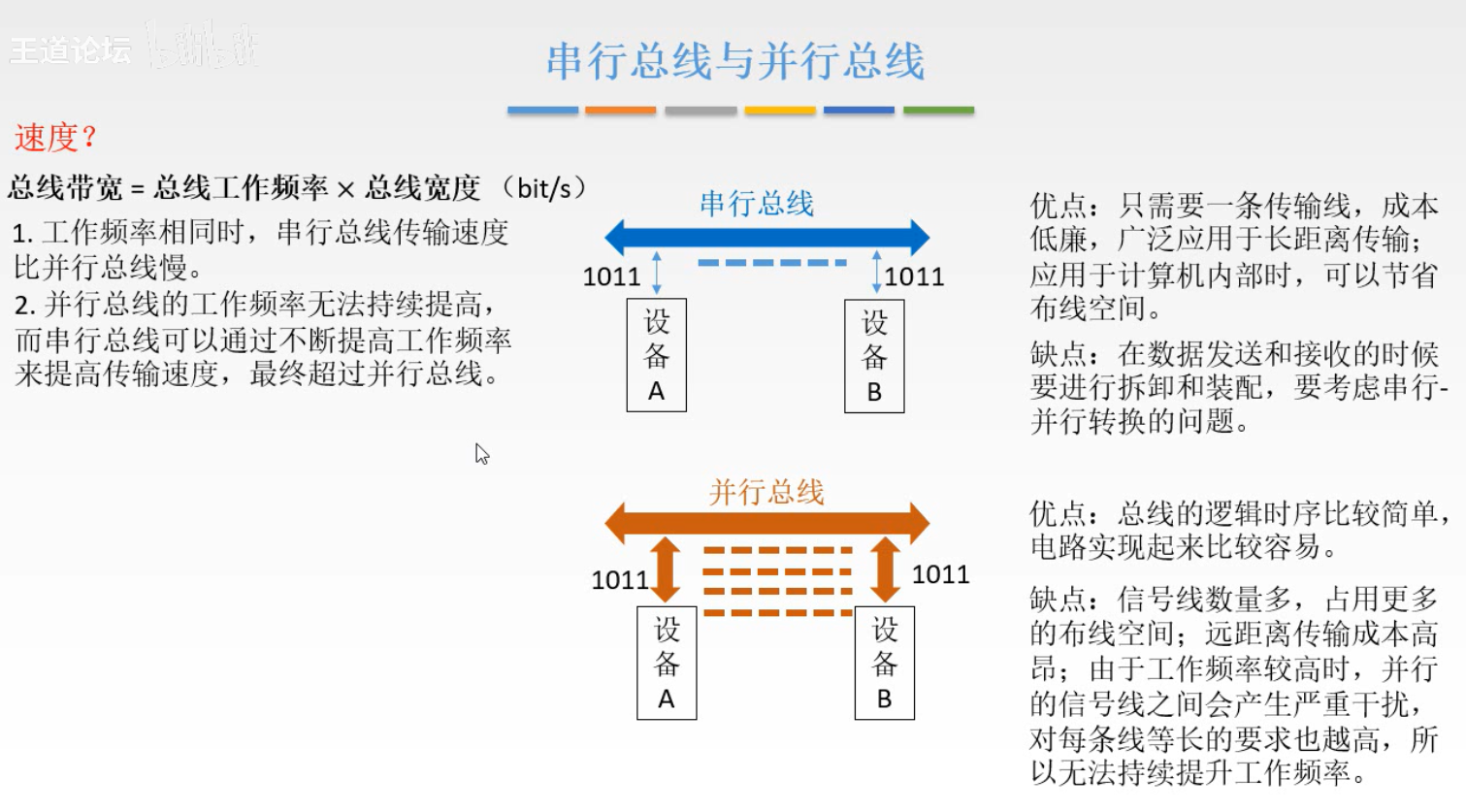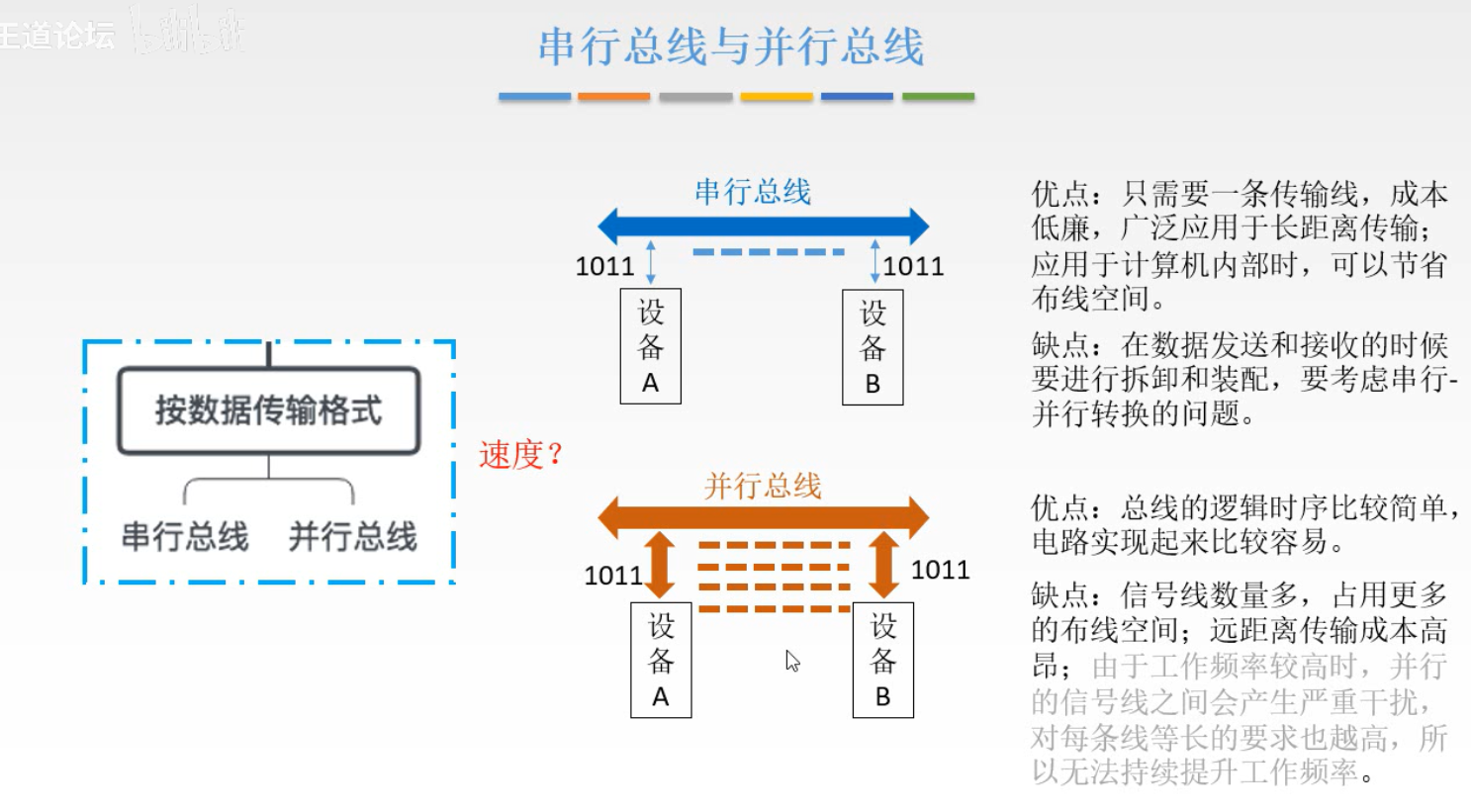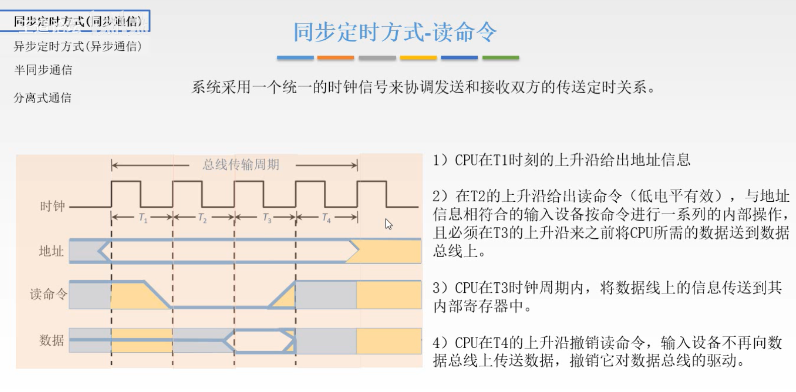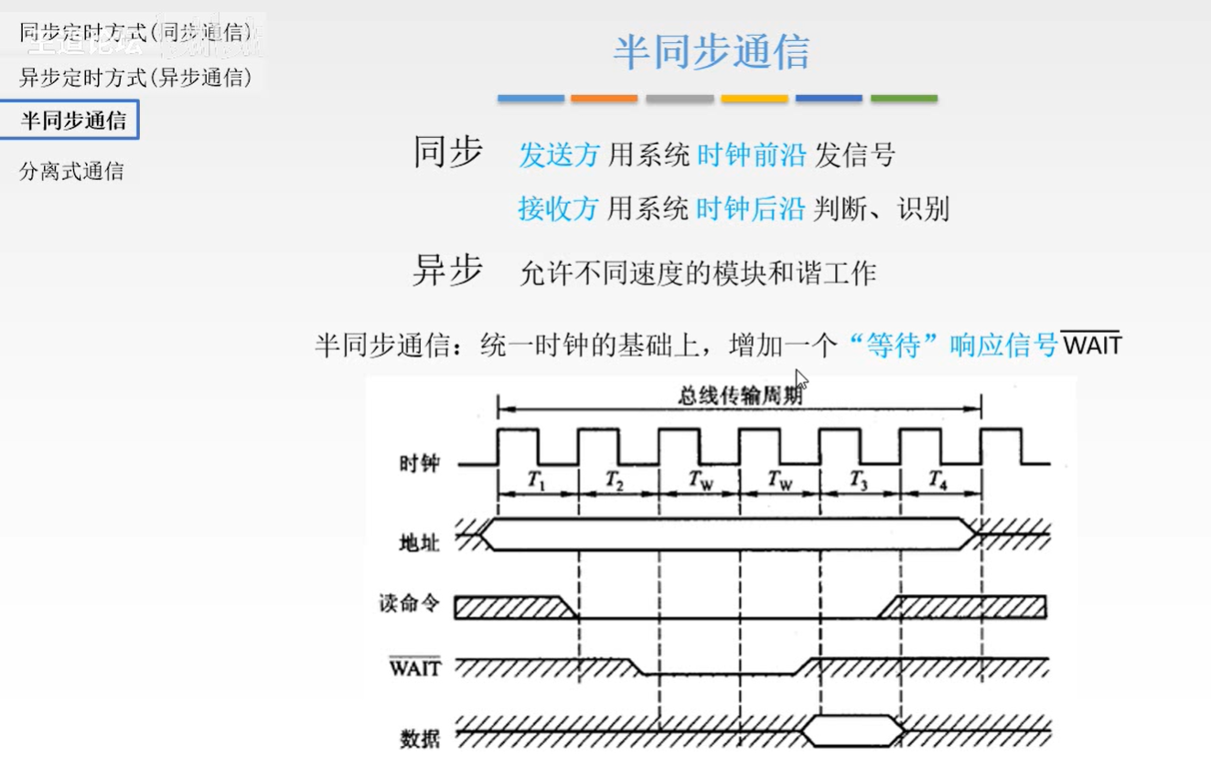 1. 同一个总线不能既采用同步方式又采用异步方式通信吗? 半同步通信总线可以。这类总线既保留了同步通信的特点,又能采用异步应答方式连接速度相差较大的设备。通过在异步总线中引入时钟信号,其就绪和应答等信号都在时钟的上升沿或下降沿有效,而不受其他时间的信号干扰。 例如,某个采用半同步方式的总线总是从某个时钟开始,在每个时钟到来时,采样 Wait 信号,若无效,则说明数据未准备好,下个时钟到来时,再采样 Wait 信号,直到检测到有效,再去数据线上取数据。PCI 总线也是一种半同步总线,它的所有事件都在时钟下降沿同步,总线设备在时钟开始的上升沿采样总线信号。