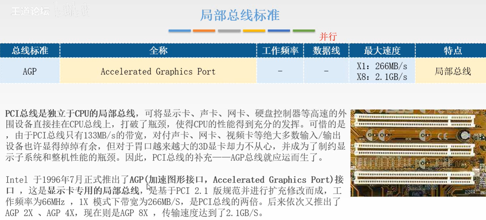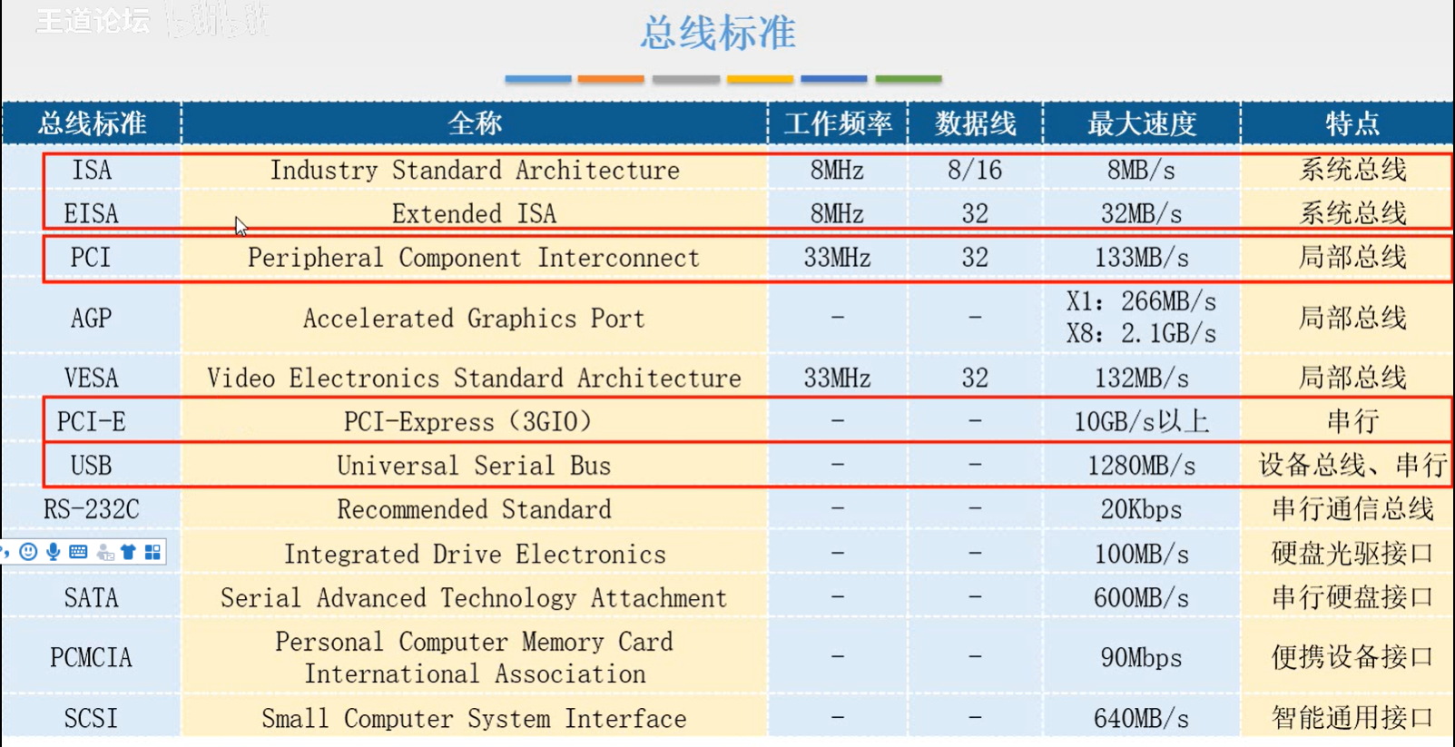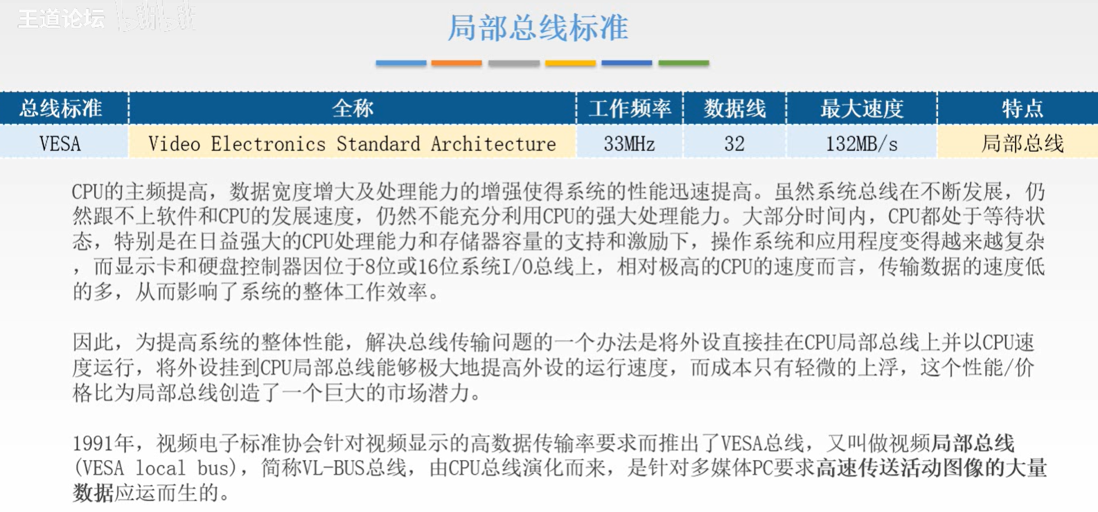 • 局部总线标准:在 ISA. 总线和 CPU 总线之间增加的一级总线或管理层,如 PCI、PCI-E、VESA、AGP 等,可以节省系统的总带宽。