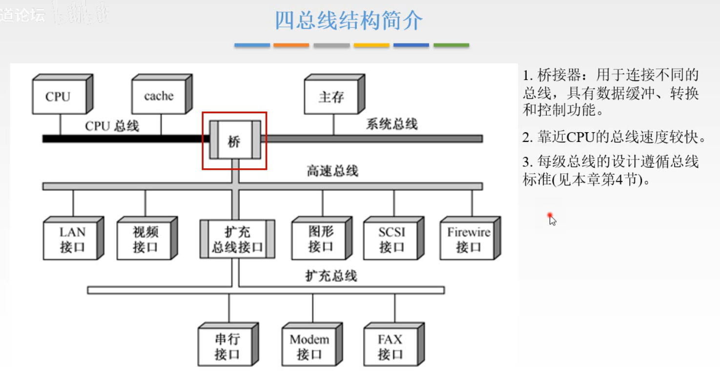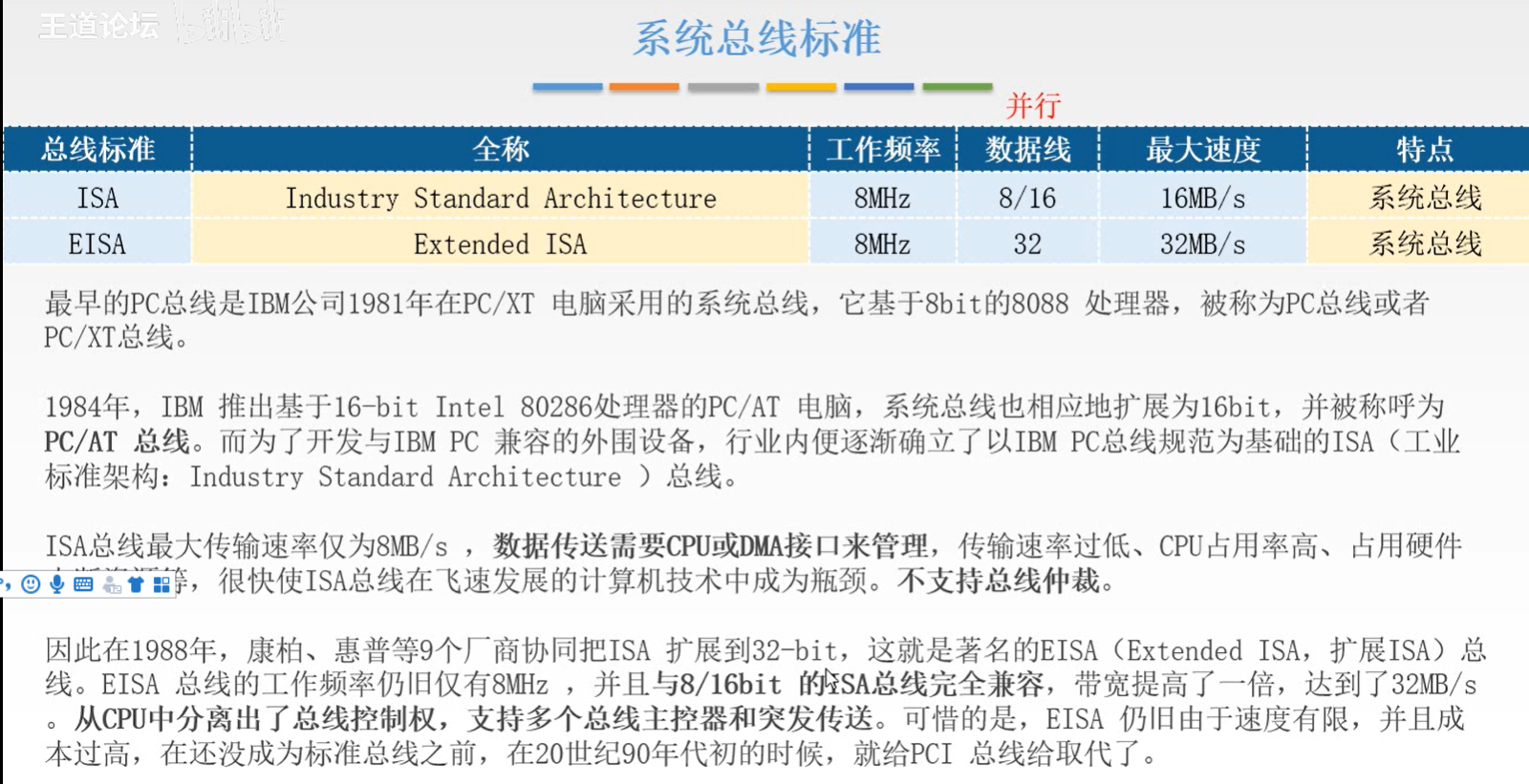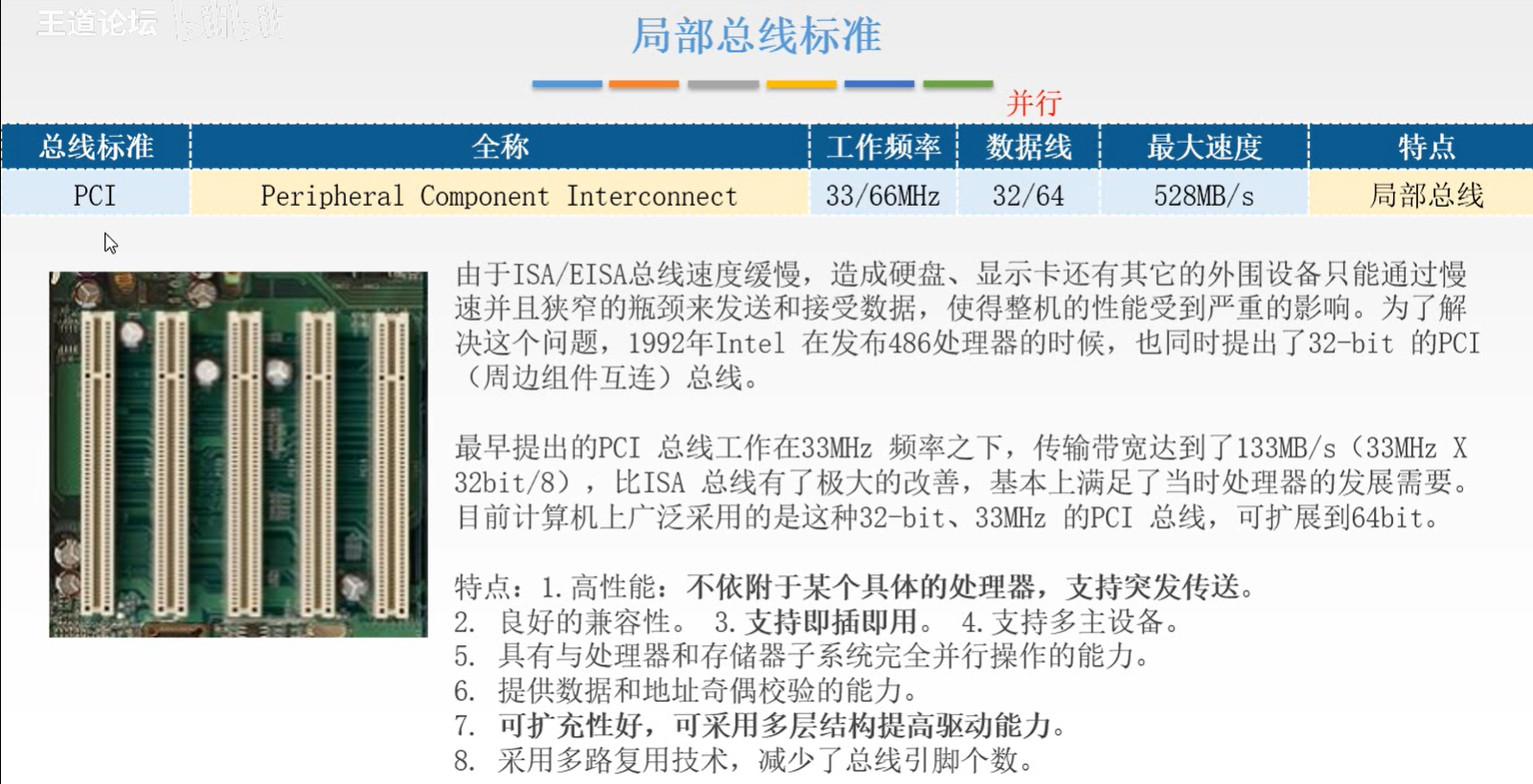 • 局部总线标准:在 ISA. 总线和 CPU 总线之间增加的一级总线或管理层,如 PCI、PCI-E、VESA、AGP 等,可以节省系统的总带宽。