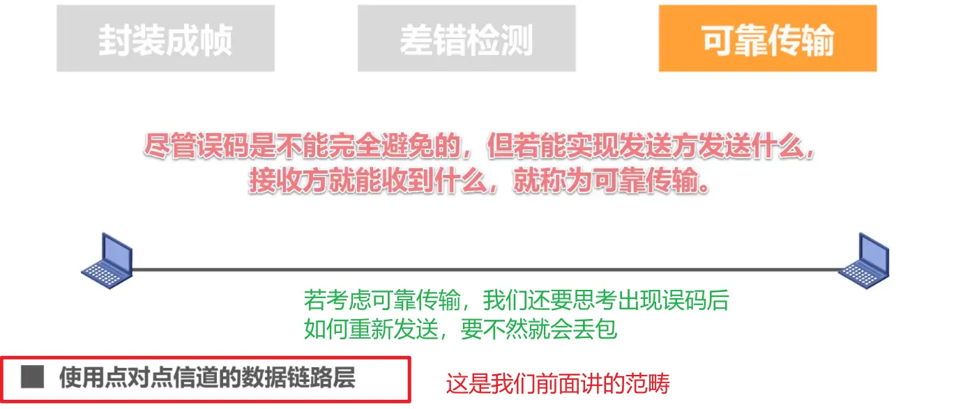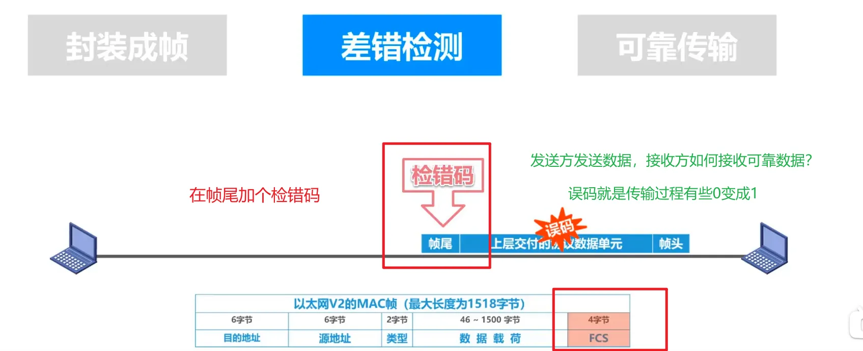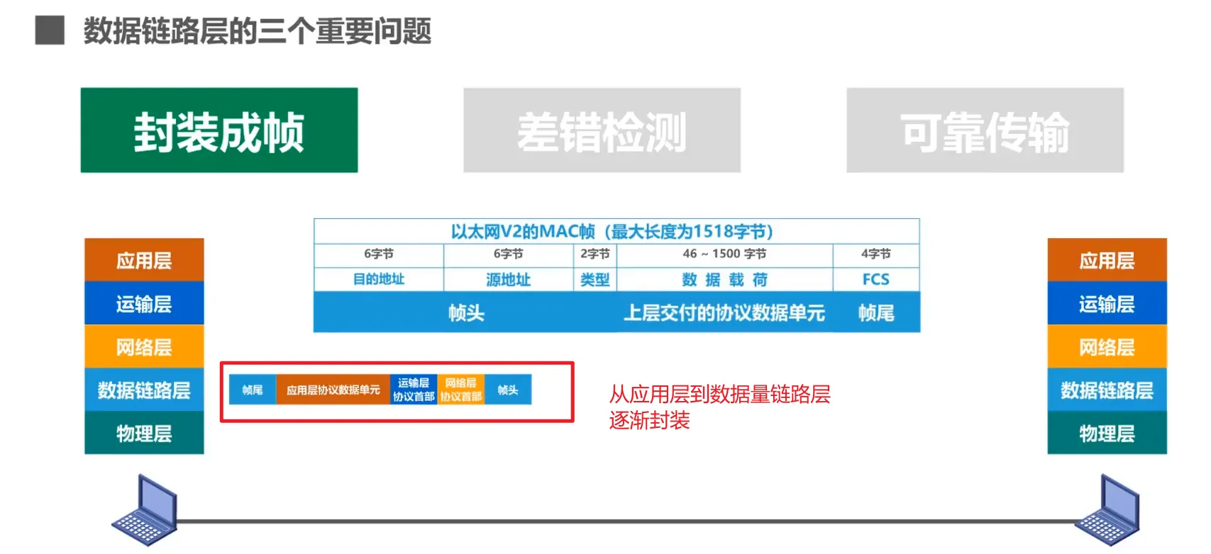 up:: 2.7-第2章物理层习题课 学习视频 3.1-数据链路层概述 笔记 说明:数据链路层重要问题 使用点对点信道传输方式 三个重要问题 封装成桢 差错检测 可靠传输 使用广播信道的数据链路层 如何确定发送与接收方 多台主机发送数据帧如何避免碰撞