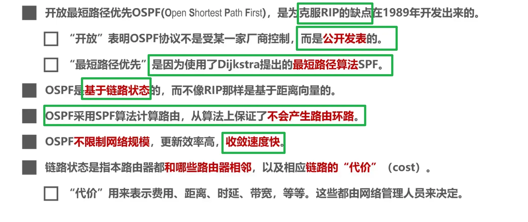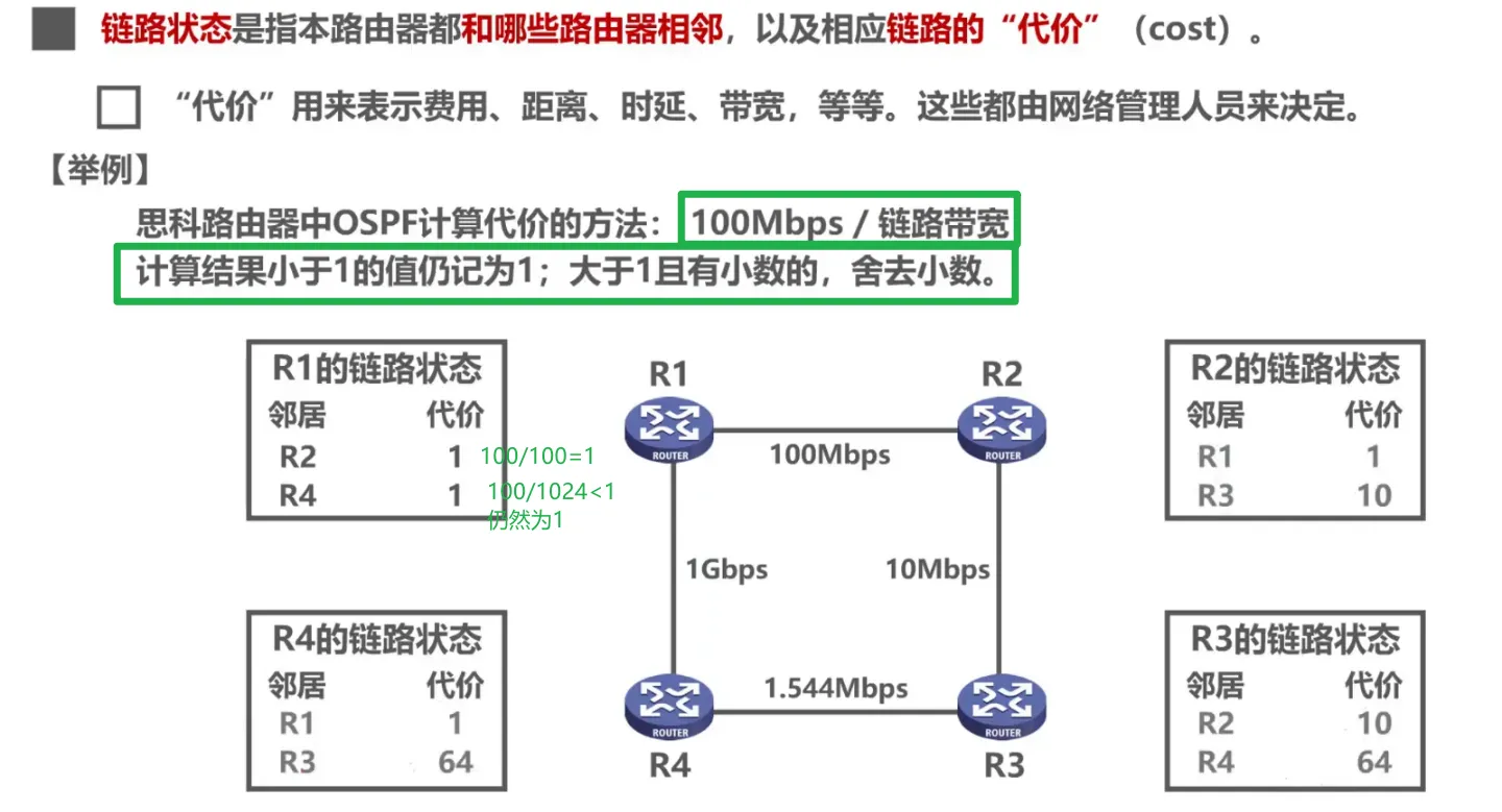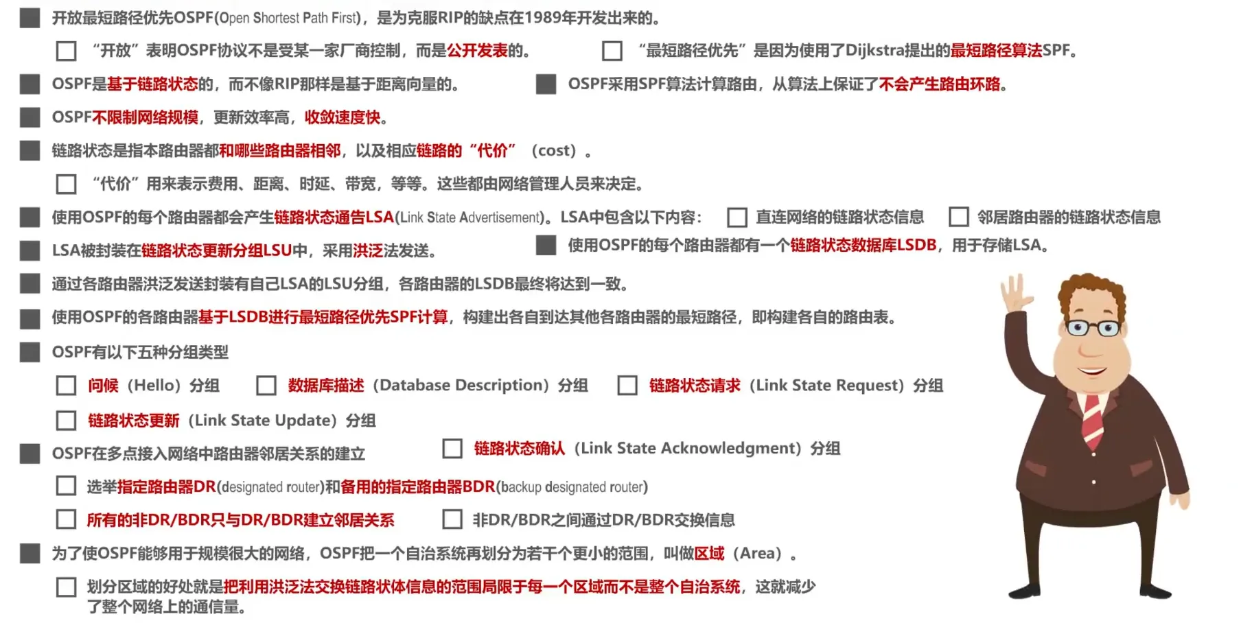 up:: 4.6.2-路由信息协议RIP的基本工作原理 学习视频 4.6.3-开放最短路径优先OSPF的基本工作原理 笔记 小结: 基本介绍 链路代价举例 关于问候分组 链路状态数据库LSDB 进行SPF算法 OSPF各种类型 工作过程 关于邻居关系的建立 减少重复两两交换LSA,浪费线路资源,类似于路由环路。。。 关于区域的划分