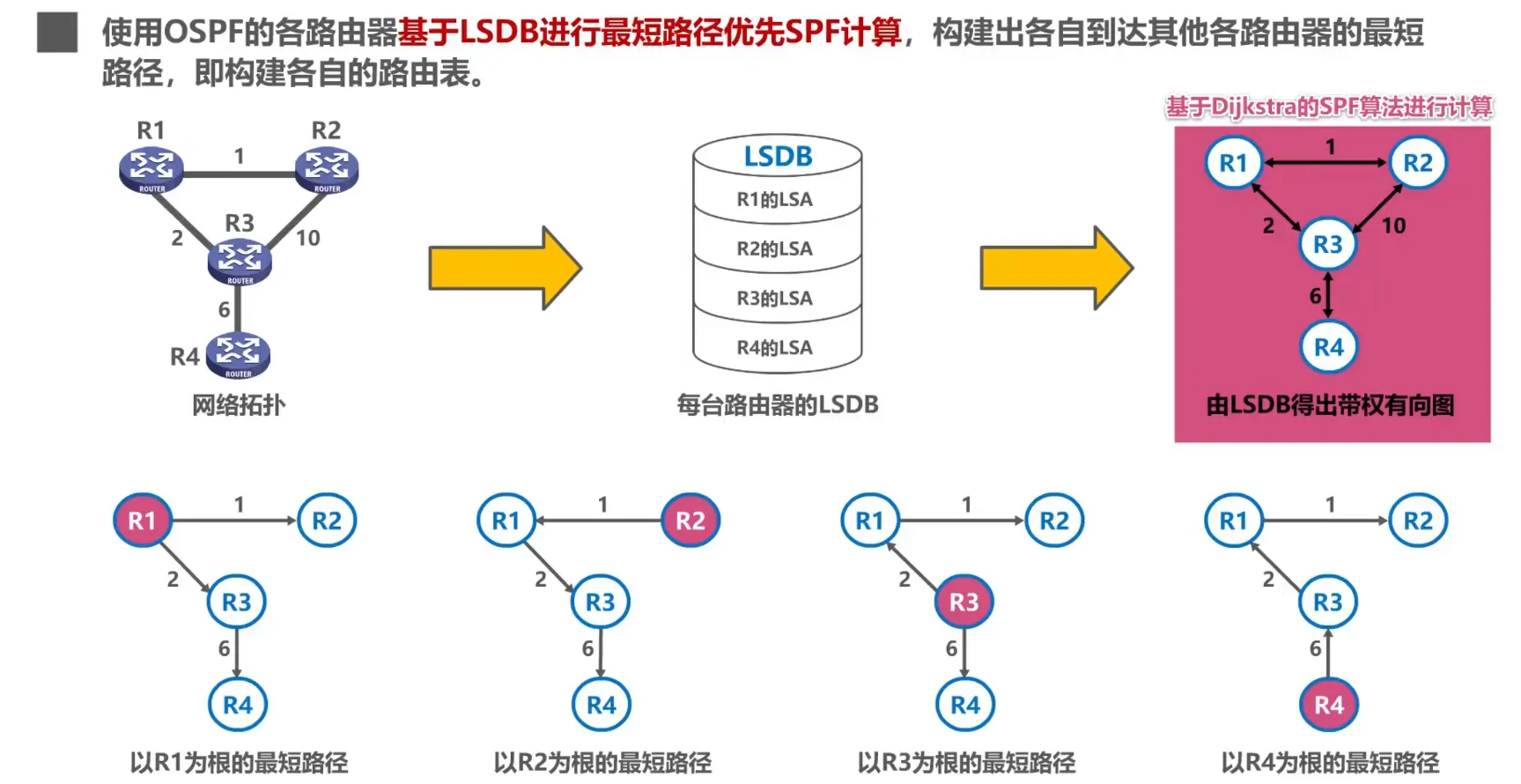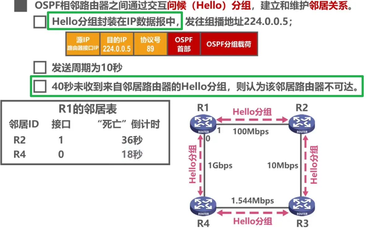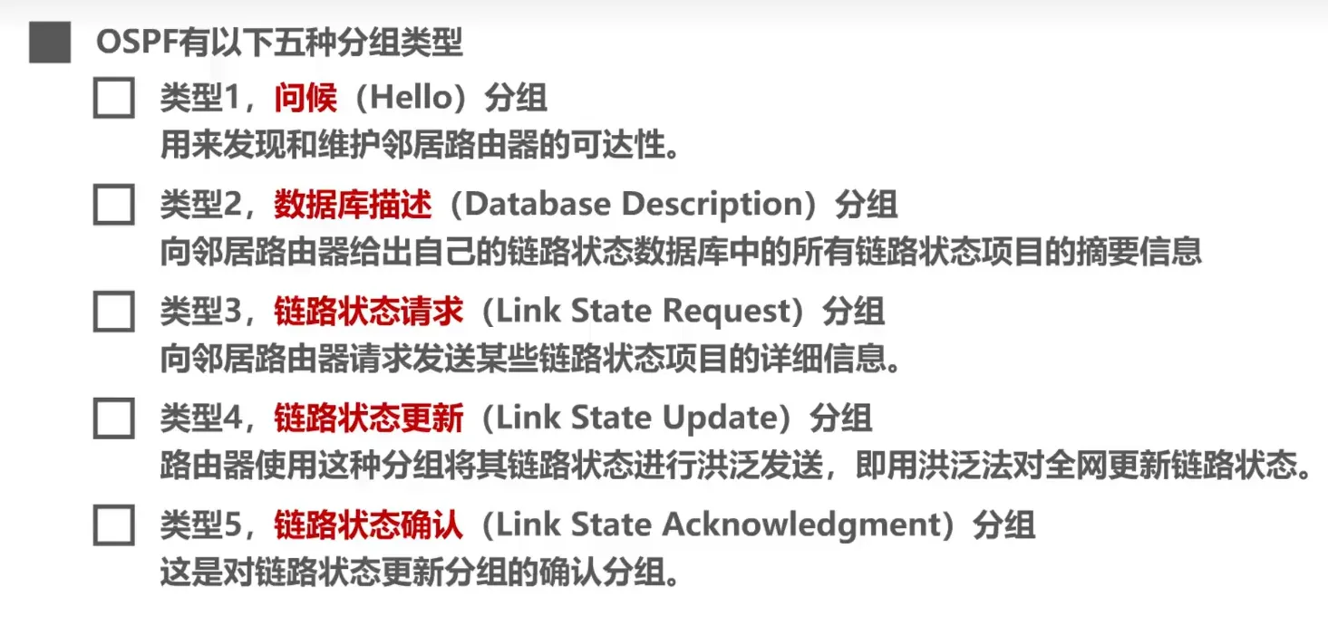 up:: 4.6.2-路由信息协议RIP的基本工作原理 学习视频 4.6.3-开放最短路径优先OSPF的基本工作原理 笔记 小结: 基本介绍 链路代价举例 关于问候分组 链路状态数据库LSDB 进行SPF算法 OSPF各种类型 工作过程 关于邻居关系的建立 减少重复两两交换LSA,浪费线路资源,类似于路由环路。。。 关于区域的划分