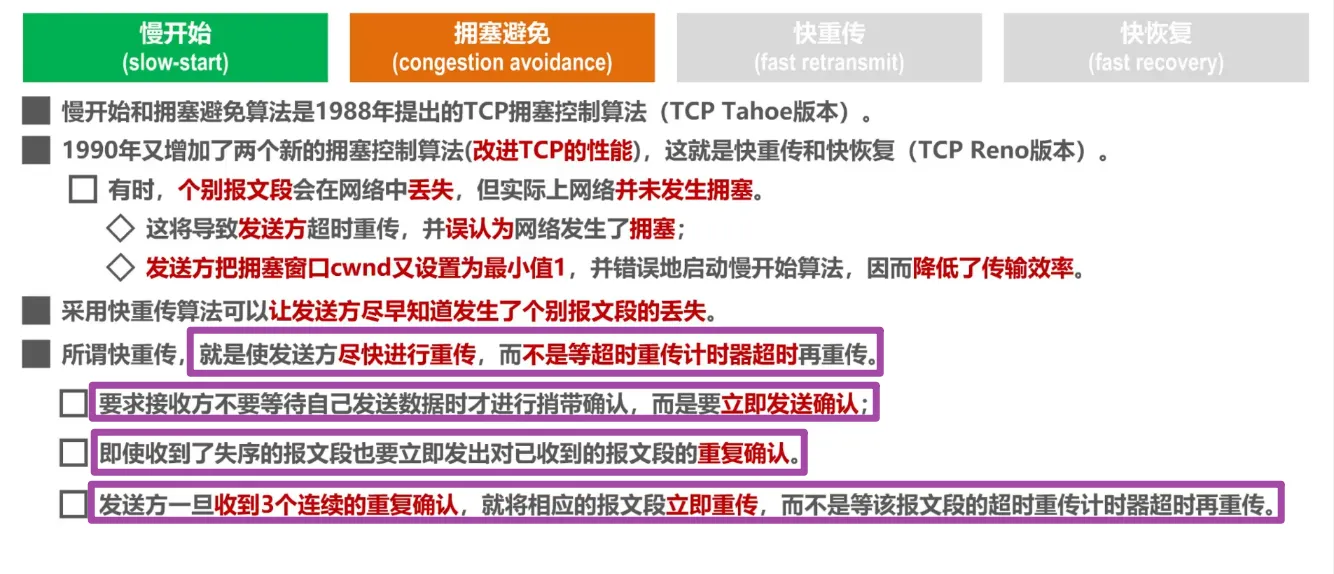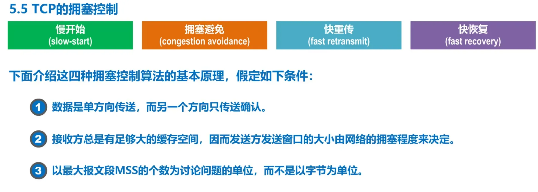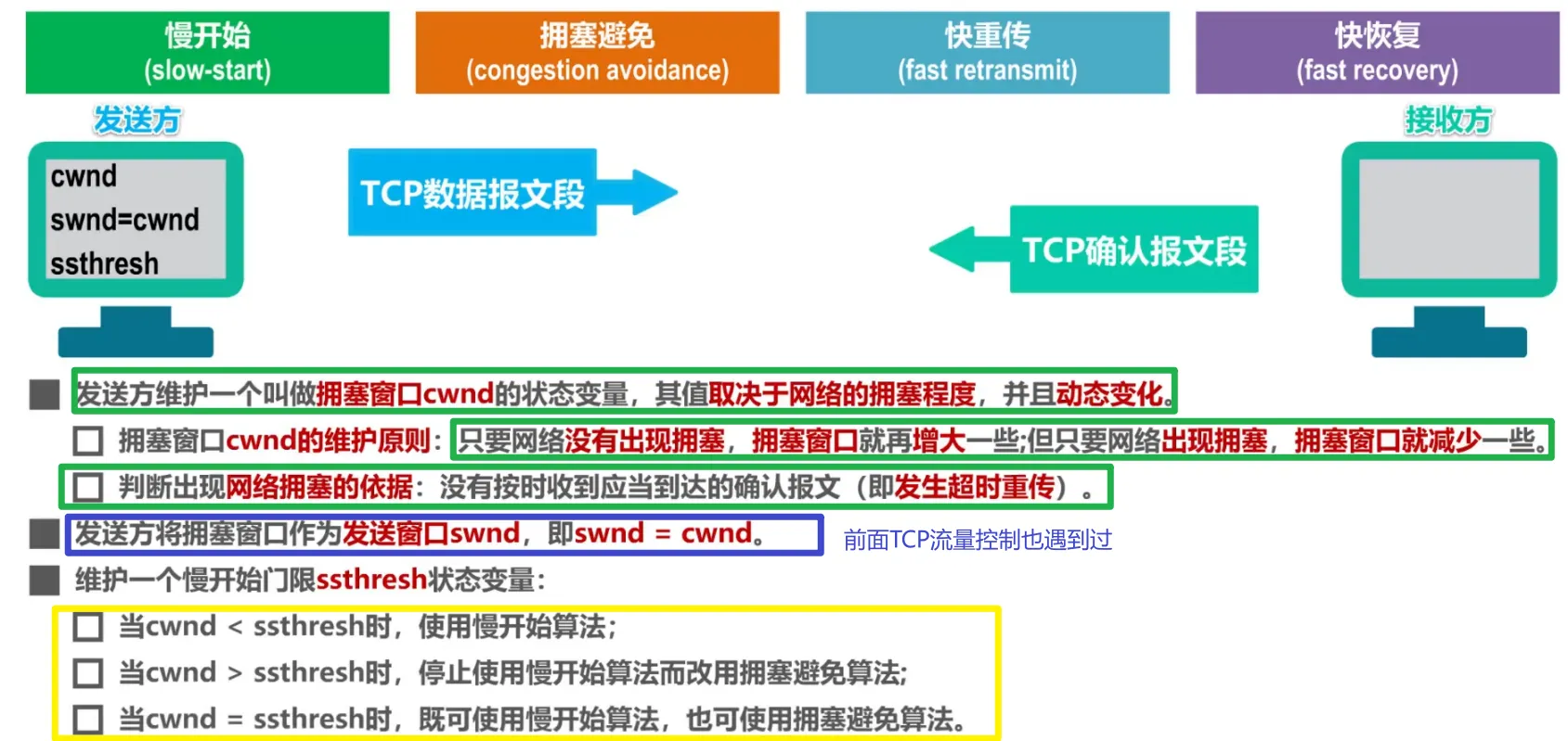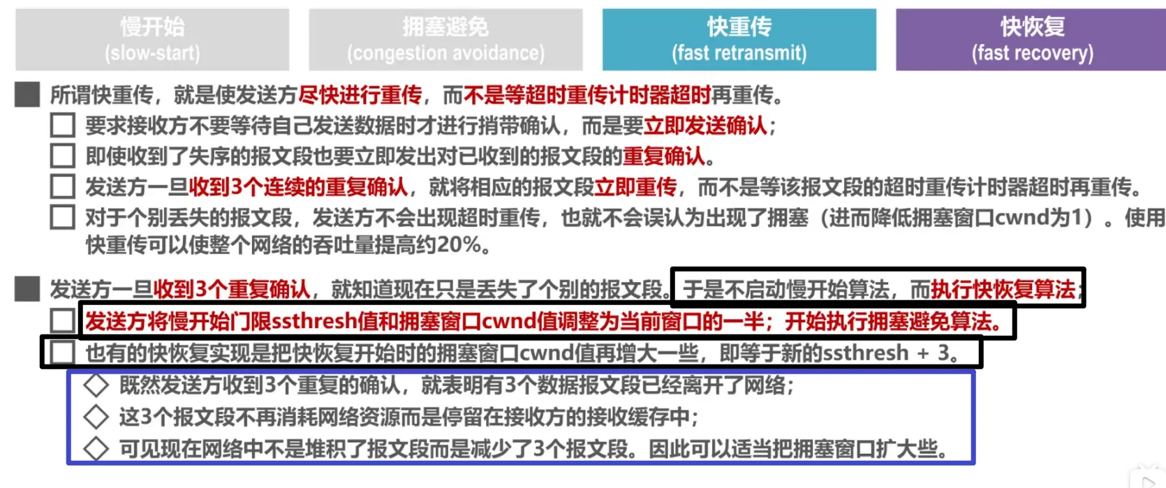 up:: 5.4-TCP的流量控制 学习视频 5.5-TCP的拥塞控制 笔记 四种拥塞控制 重要概念: 慢开始和拥塞避免 慢开始 拥塞避免 到达门限值,然后继续拥塞避免: 快重传和快恢复 快重传 快恢复 例题练习