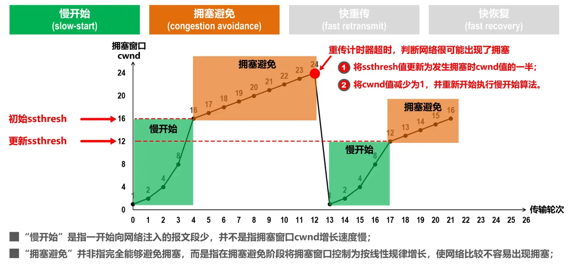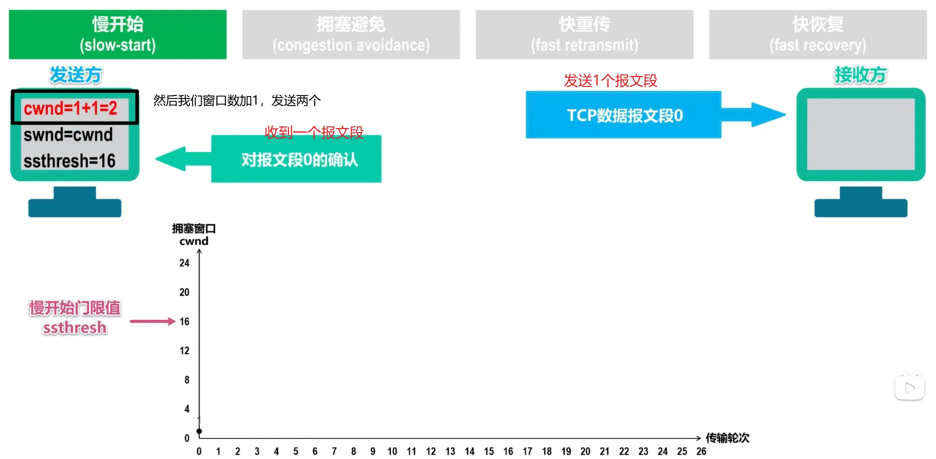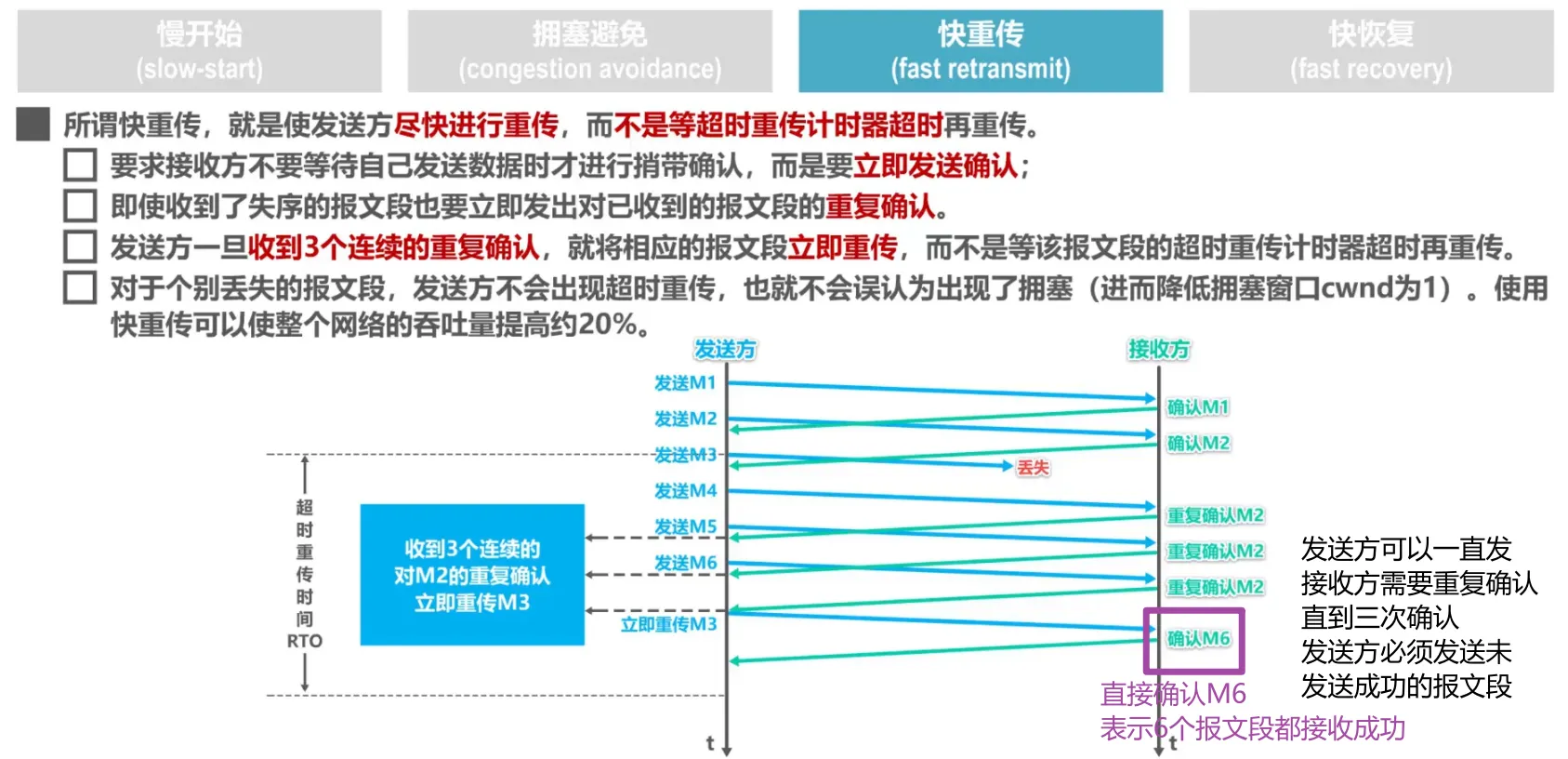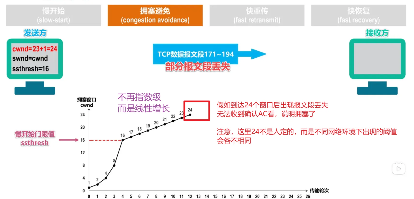 up:: 5.4-TCP的流量控制 学习视频 5.5-TCP的拥塞控制 笔记 四种拥塞控制 重要概念: 慢开始和拥塞避免 慢开始 拥塞避免 到达门限值,然后继续拥塞避免: 快重传和快恢复 快重传 快恢复 例题练习