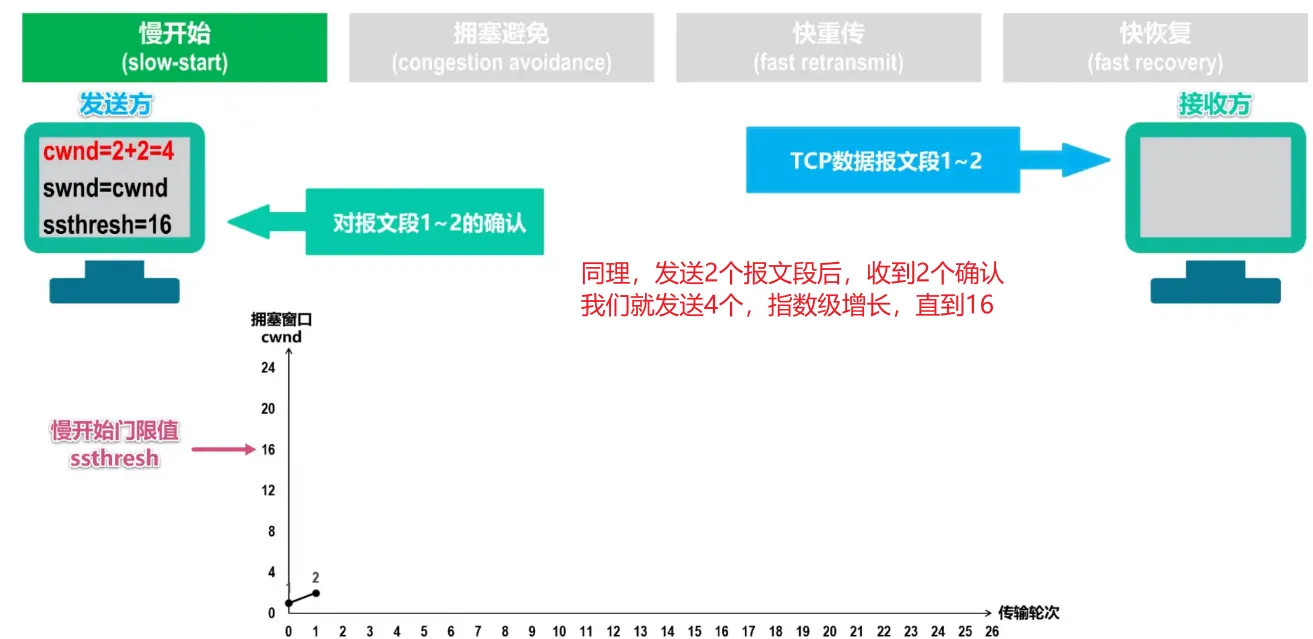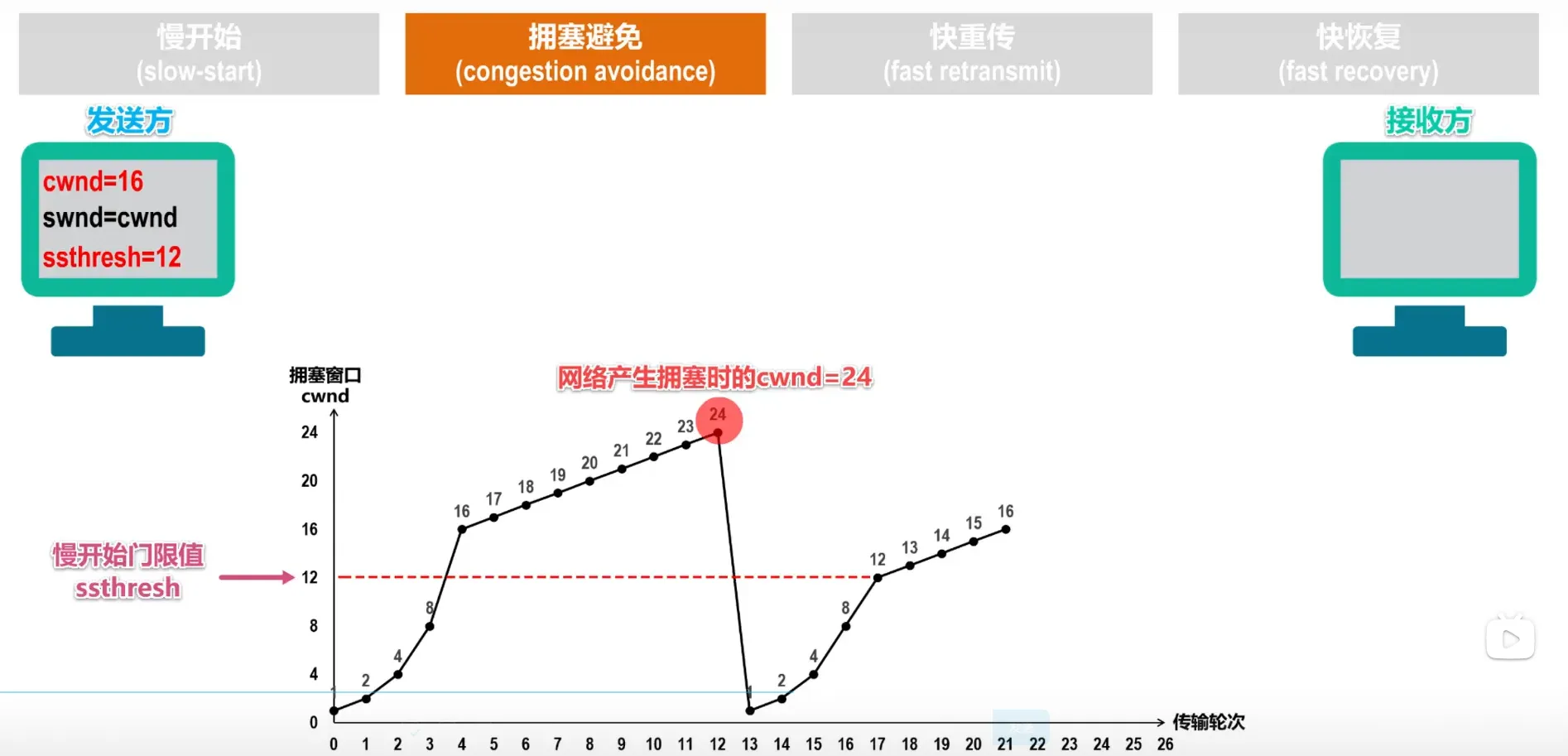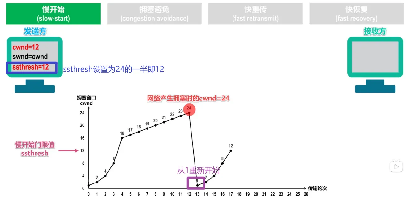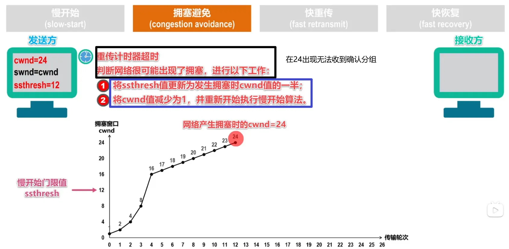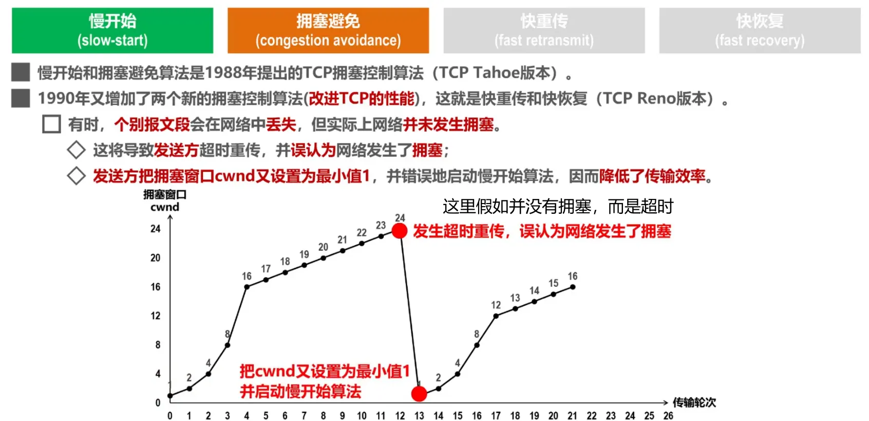 up:: 5.4-TCP的流量控制 学习视频 5.5-TCP的拥塞控制 笔记 四种拥塞控制 重要概念: 慢开始和拥塞避免 慢开始 拥塞避免 到达门限值,然后继续拥塞避免: 快重传和快恢复 快重传 快恢复 例题练习