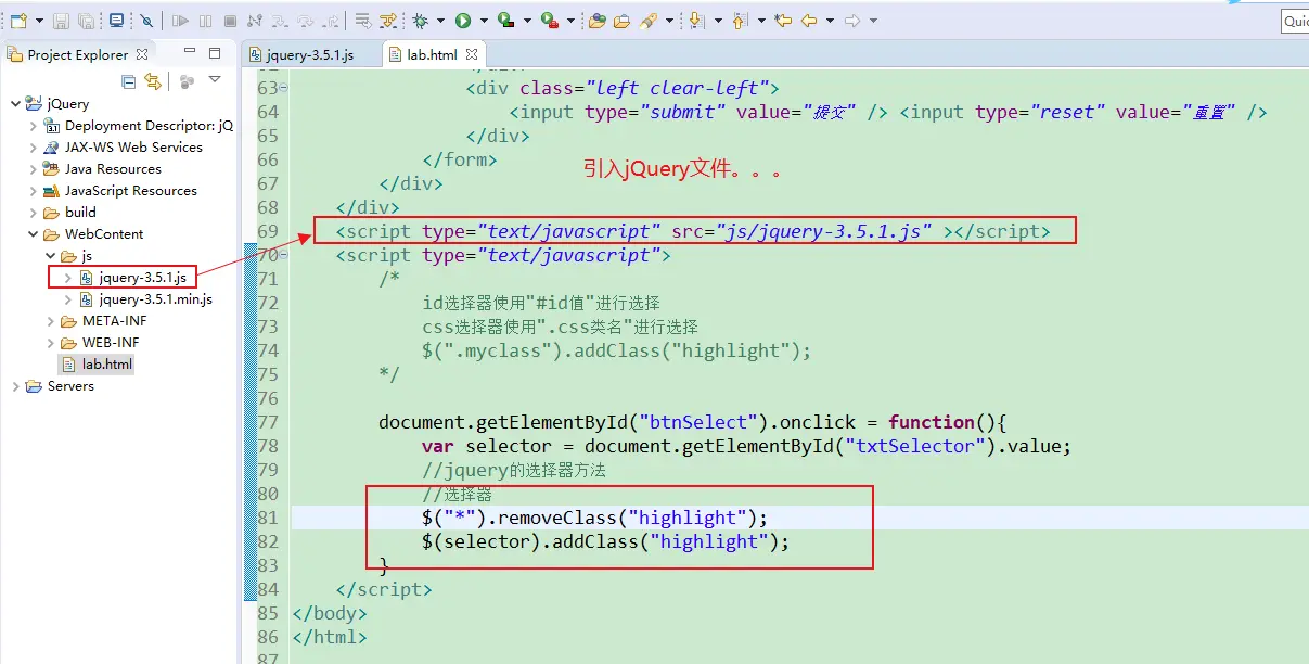 <script type="text/javascript" src="js/jquery-3.5.1.js" ></script>然后,通过选择器 $(选择器表达式) 选择页面元素,然后通过 $(选择器表达式).addClass(“highlight”); addClass(“highlight”)是指 将hightlight中定义的修饰策略应用到选择器选中的页面元素上去 ;