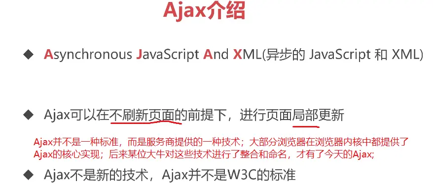 (1)以前遇到的请求都是和一个网页面联系在一起的,即前端发起一个请求就是会在一个页面绑定在一起,,也可以理解成以前接触到的都是为了展示一个全新的页面而发起一个请求,,也可以理解成每发起一个新的请求,都会创建一个新的界面来展示本次请求响应的内容。。。。但ajax不是这样,ajax的请求内容并不是为了展示一个新的界面,而是在将本次请求的响应内容,局部刷新展示在已有界面上,本质是,已有的页面是发起一个没有和新的页面绑定的请求(这个请求和已有界面的局部刷新有关)。。。