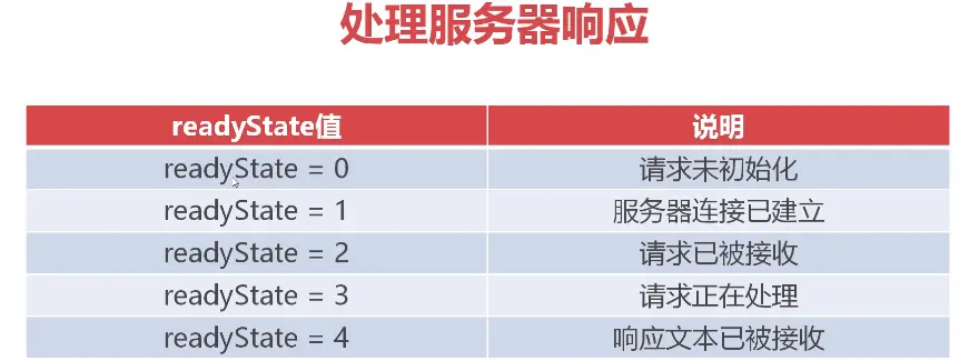 (2)readyState用以判断Ajax执行到了哪一步,最重要的是为4的时候;( 注:readyState是XmlHttpRequest对象的属性