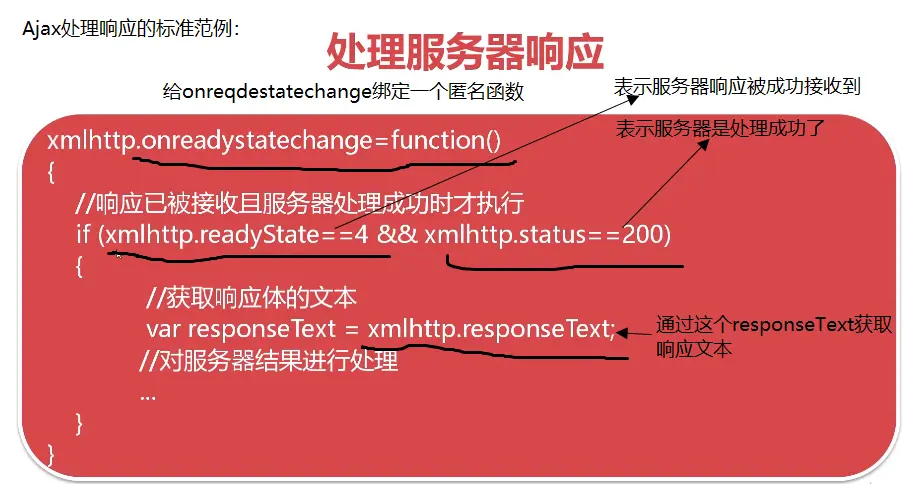 获取服务器响应的文本后,对这个文本进行后续处理就可以了;(这个文本一般是JSON形式的,JSON作为一种功能强大、前后端都能解释的表示方法很给力哦)