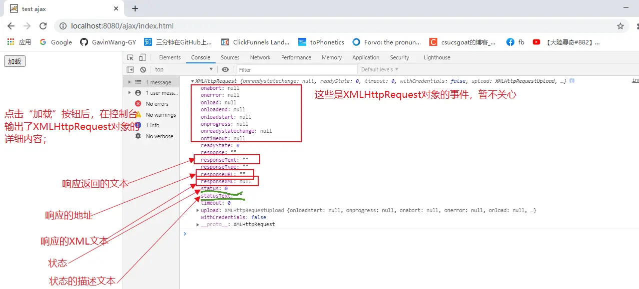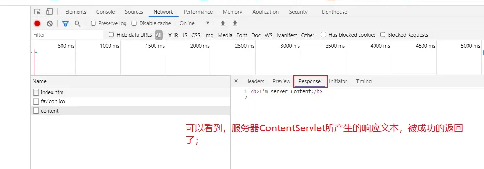 (1)其中请求中并没有附带请求参数;(2)响应的数据也仅仅是响应一个html字符串;一切都很简单,主要目的是展示Ajax的使用步骤而已;;;所以,上面的演示案例仅仅是一个骨架,或者是一个玩具式的范例。。