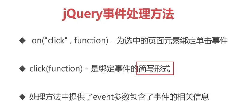上面代码的简化形式: 使用jQuery事件时候, 一般使 用简写形式!!!!!