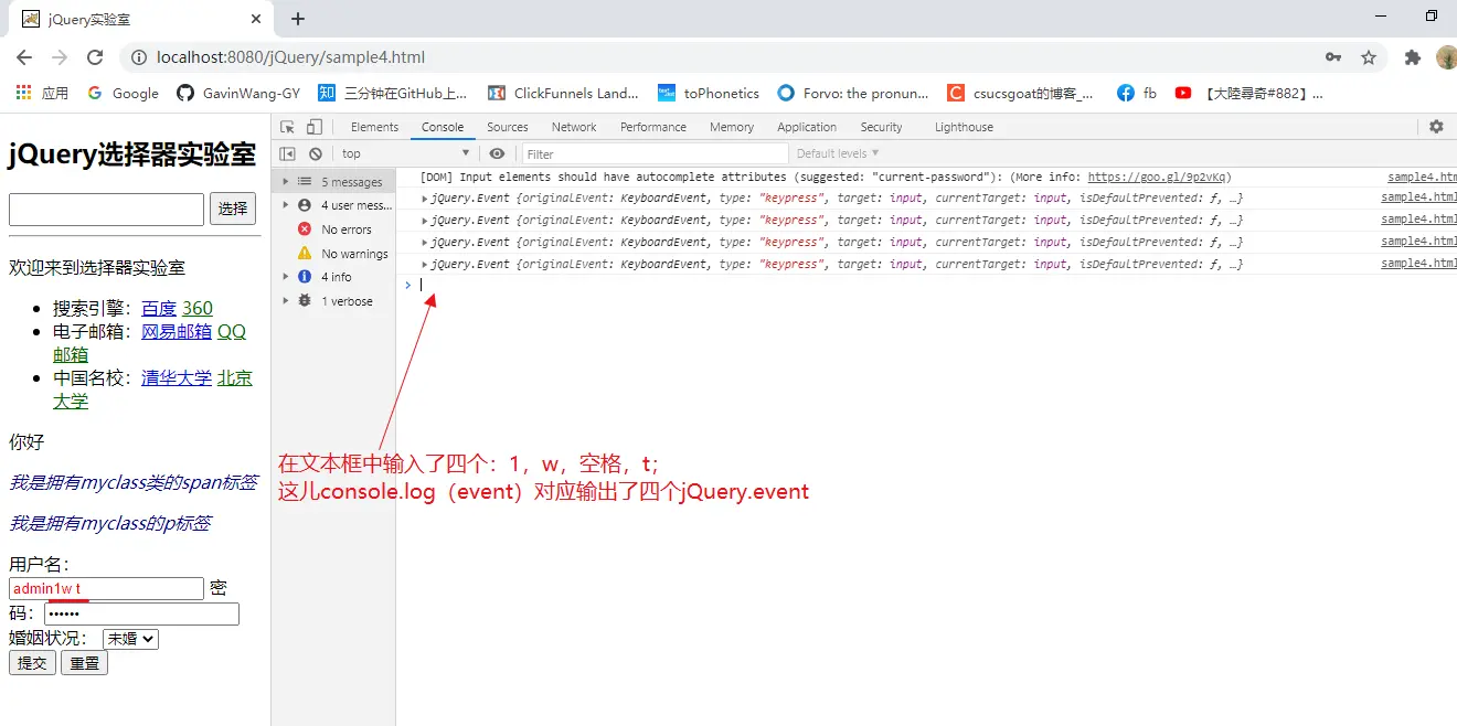 可以发现,jQuery调用事件,还是先用选择器选择页面元素,然后页面元素再调用方法 !!!