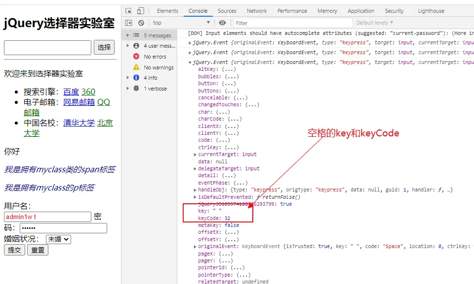 当知道空格这个字符对应的keyCode为32后,就可以在程序中加以判断处理: