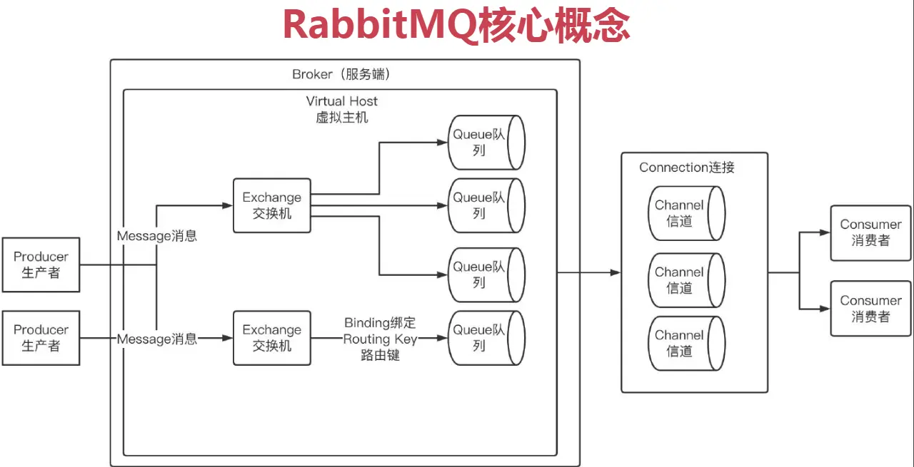 消息经过交换机,并且发送到Queue队列后,进一步其希望发送给Consumer消费者;然后,中间需要经过 Connection连接 ;在连接中,会有多个 Channel信道 ;这些哦消息数据,都是在Channel中进行读写的;然后,消费者会从中提取到自己想要的消息并且后续进行处理;