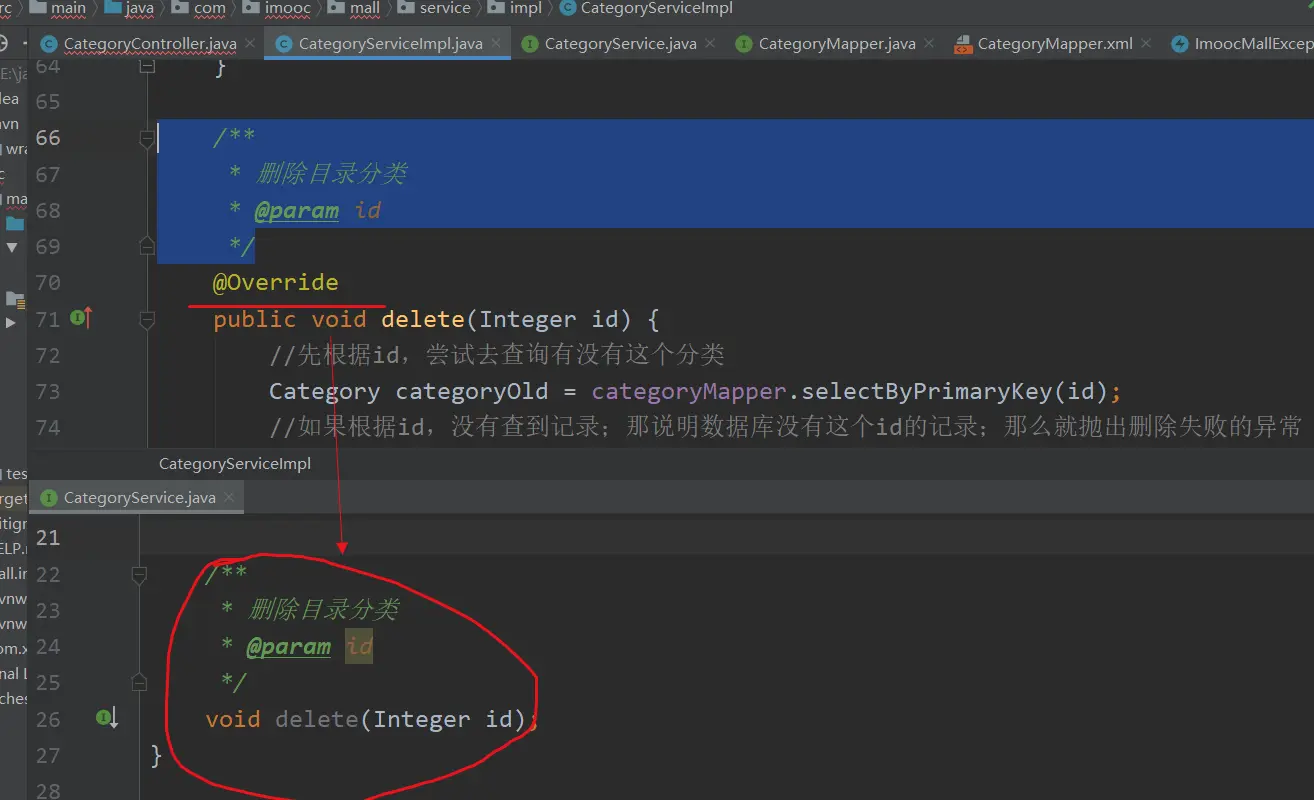 3.在CategoryServiceImpl实现类中,编写删除分类的方法delete();然后在CategoryService接口中,反向生成方法的声明;