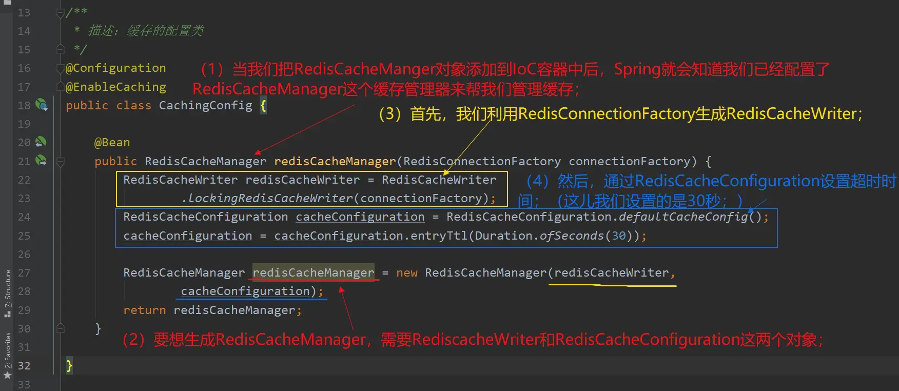 5.创建配置类,去配置redis:这儿配置的作用是配置一个Redis的缓存管理器;(这个类需要使用【@EnableCaching】注解;这个类的主要作用是:帮助【Spring的Cache缓存】去和【Redis】打交道;)
