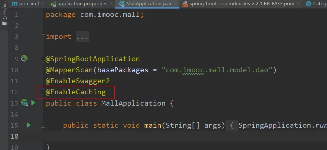 3.在程序启动类【MallApplication】上,使用【@EnableCaching】注解:打开Spring的缓存功能;