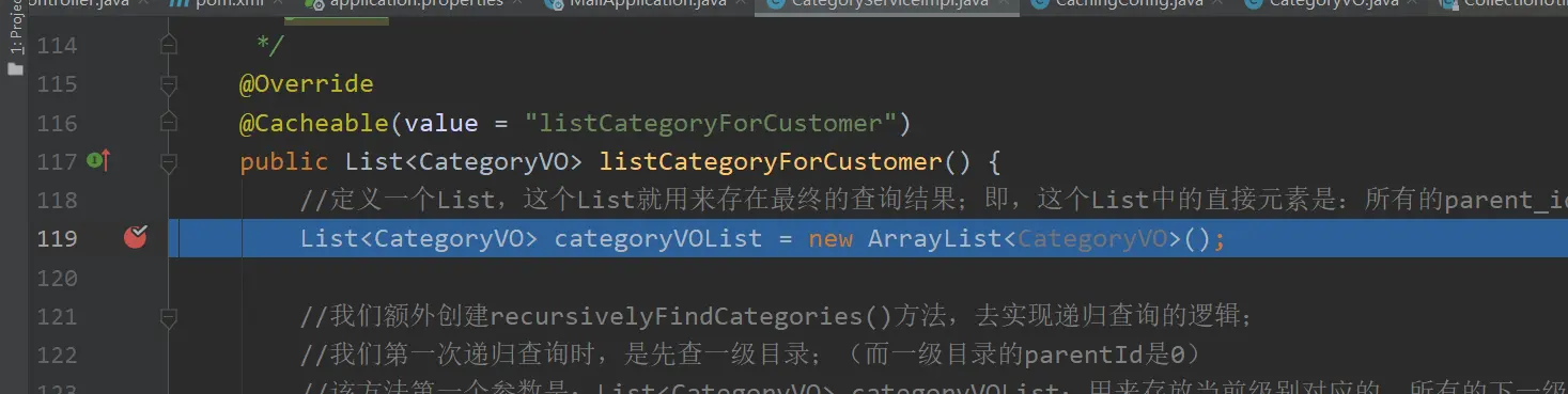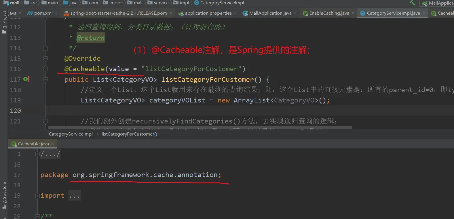 (1) @Cacheable(value=“listCategoryForCustomer”),这个注释的意思是,当调用这个方法的时候,会从一个名叫 listCategoryForCustomer的缓存中查询,如果没有,则执行实际的方法(即查询数据库),并将执行的结果存入缓存中,否则返回缓存中的对象。