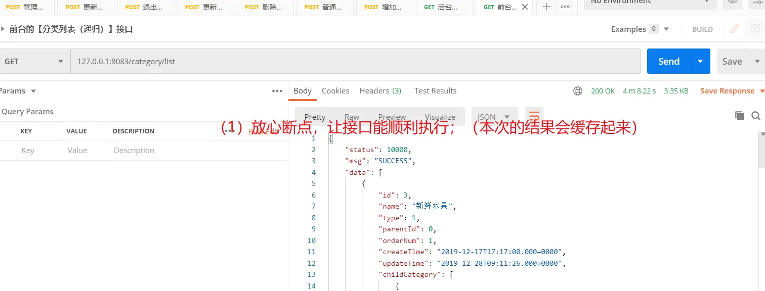 那么,我们放行断点,让其能顺利执行;(其实,这次执行成功后,获取的数据会保存到缓存中,但有效期只有30秒)
