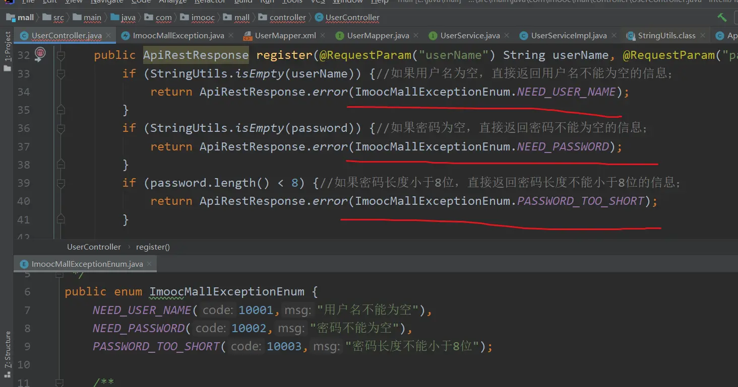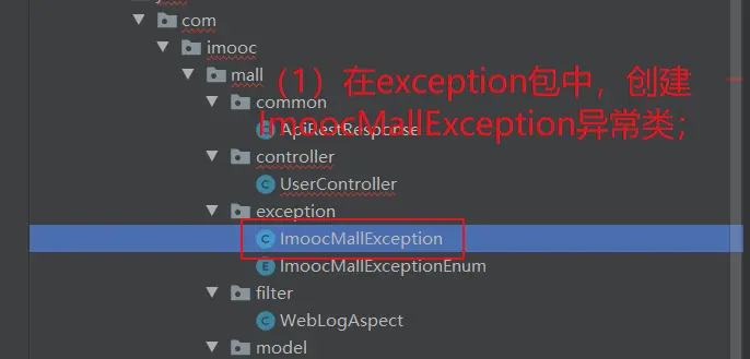 (2) 当我们在非Controller层出现错误时,我们可以把对应错误的错误码和错误信息,也定义在ImoocMallExceptionEnum枚举类中;这样一来我们也可以通过枚举类来快速构建对应的异常对象; 还是那句话,【Controller层中,检查出的问题】和【非Controller层出现的错误】,在业务层面上并没有什么区别,都是错误;即,都可以使用ImoocMallExceptionEnum枚举类来管理这些错误信息的错误码和错误信息;而为什么枚举类中要有错误码和错误信息,前面说过,这是根据接口返回的格式来定的;)
