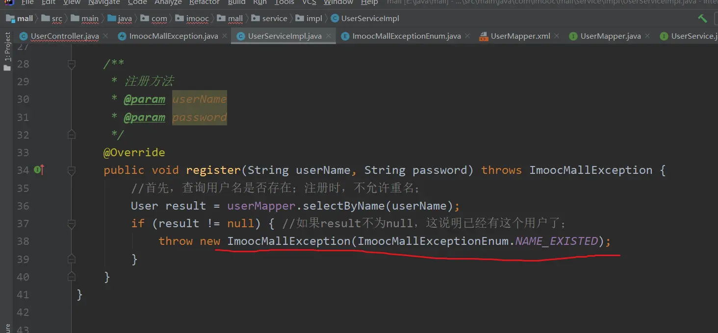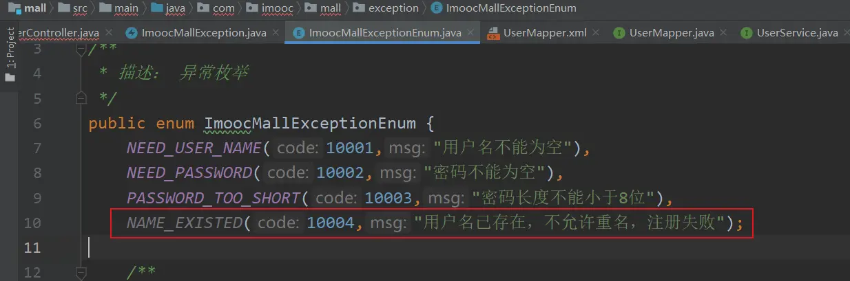 (3) 比如, 【SpringBoot电商项目用户模块注册接口开发】中,在Service层中遇到了【用户名重复】的这一错误情况;那么我们就可以在ImoocMallExceptionEnum枚举类中定义对应的错误码和错误信息: