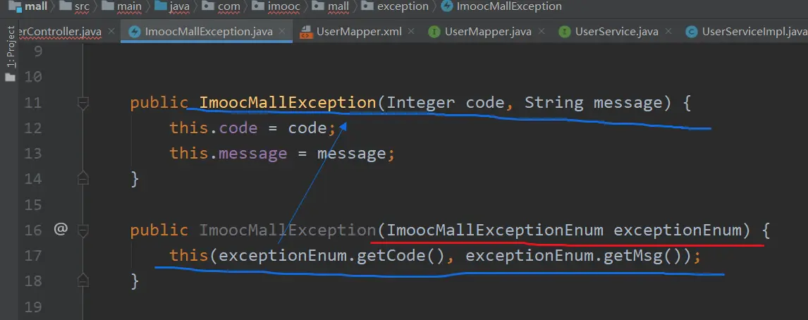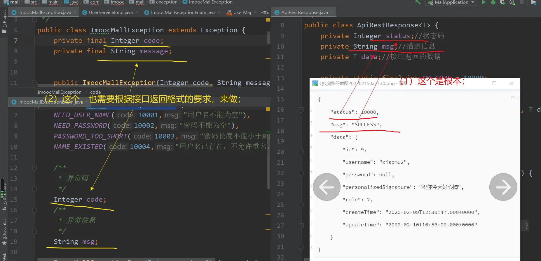(1.3)第二个需要明确的点: 我们通过向上抛自定义异常的策略,来把【非Controller层出现的错误】给反映出去;而错误的最终的处理结果,是要反映到【Controller给前端,返回的内容】上的;所以这个自定义异常中的属性,应该按照接口返回信息的格式来定义;(其实,在我们创建ApiRestRespinse统一返回对象,ImoocMallExceptionEnum枚举类的时候,都参照了接口返回信息的格式;;;还好啦,可以理解,毕竟【ApiRestRespinse统一返回对象】、【ImoocMallExceptionEnum枚举类】、【ImoocMallException自定义异常】都是为【Controller给前端,返回的内容】服务的;)这也就是,为什么我们自定义异常类中,定义了code和message两个属性的原因;