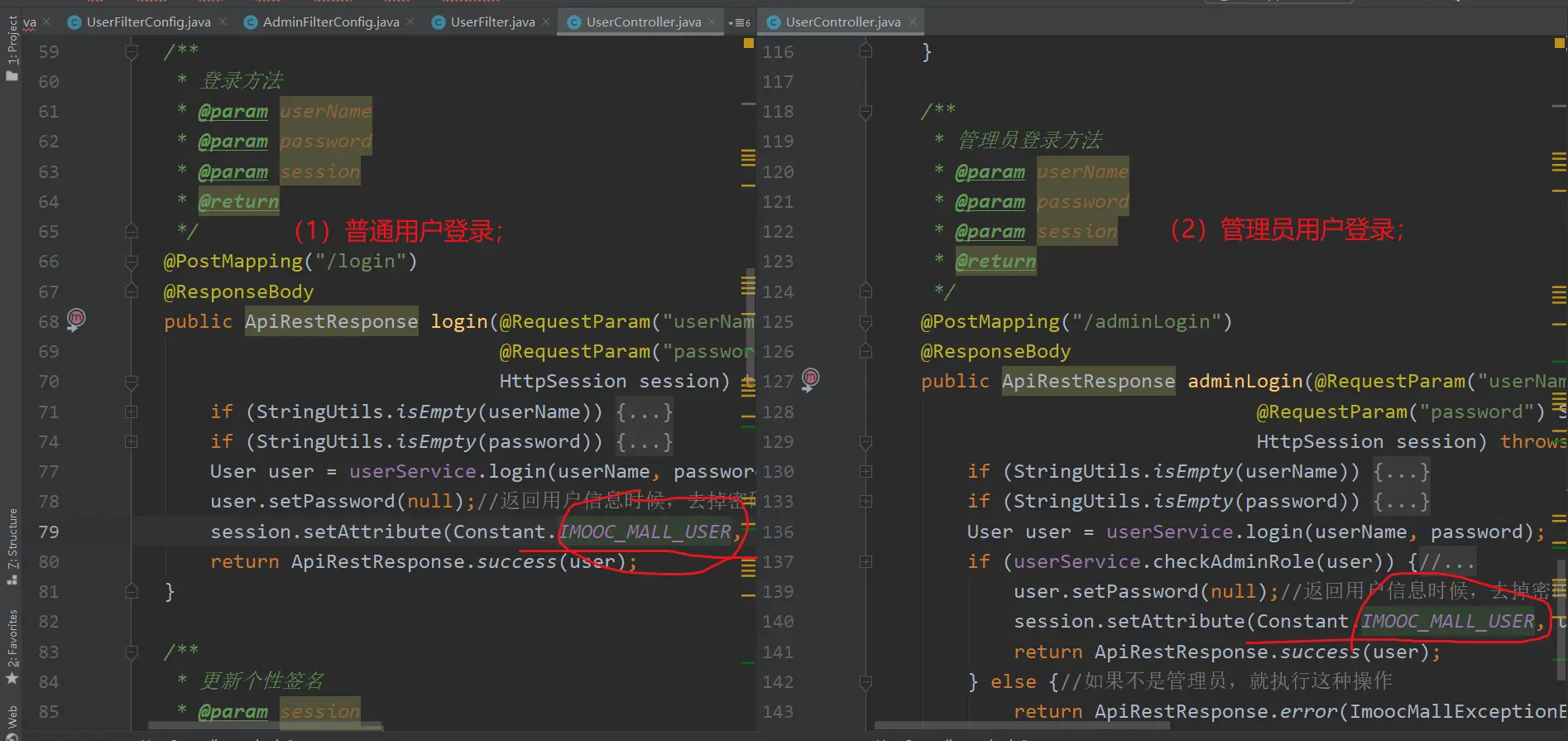 ● 其实,我们在UserController中,我们普通用户登录和管理员用户登录时,保存在Session中的User对象其名字我们也起做一样了;