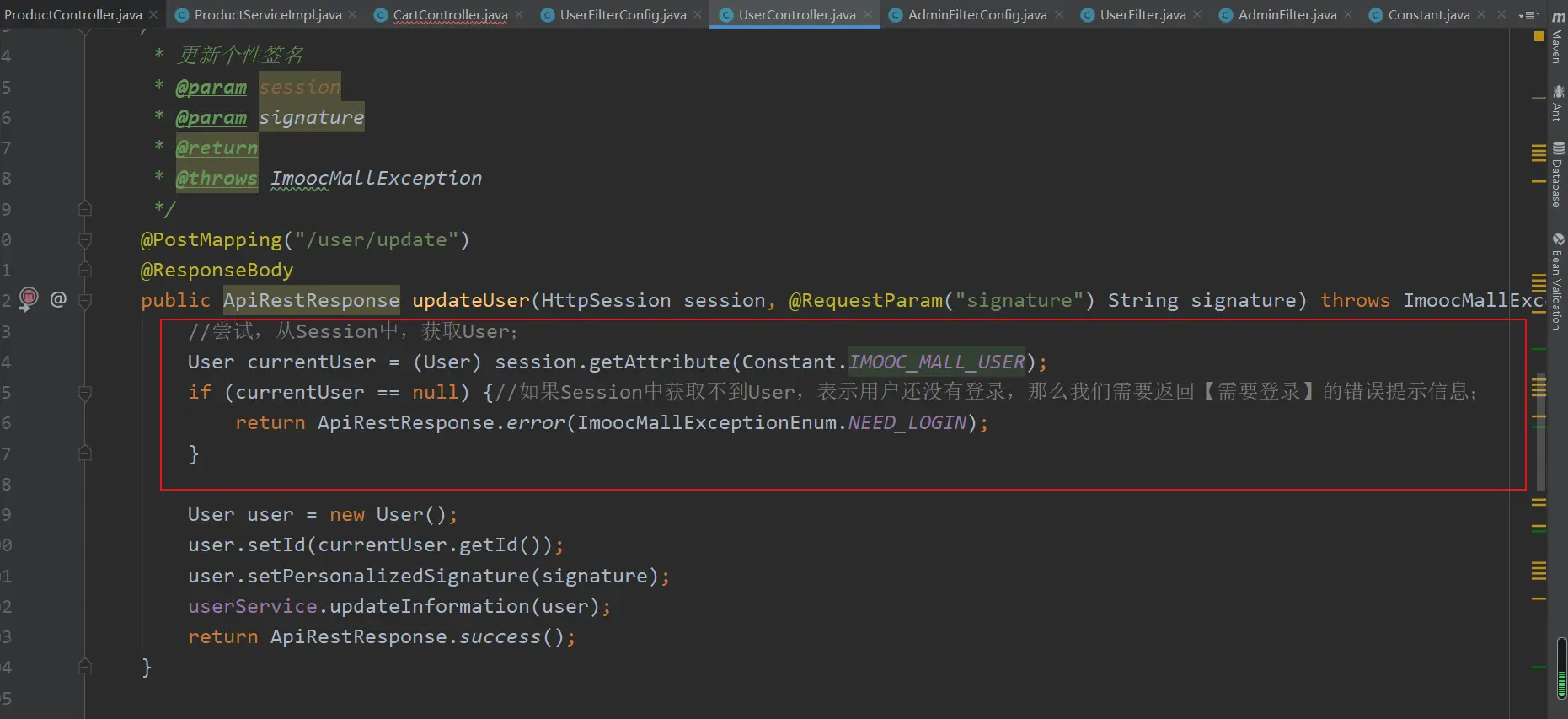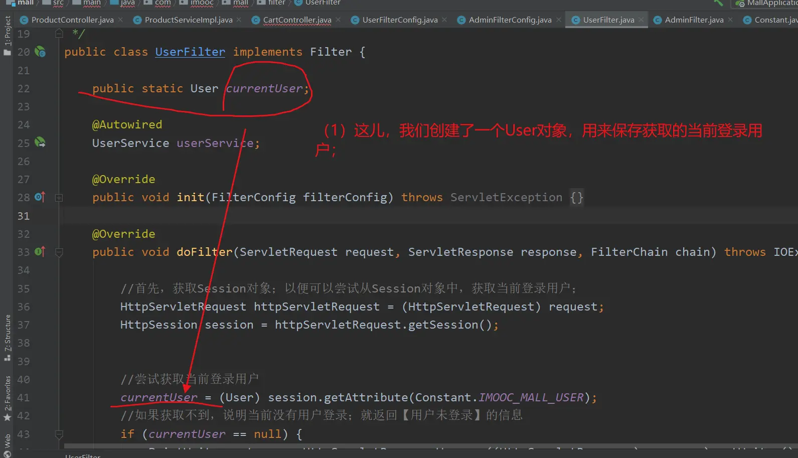 currentUser = (User) session.getAttribute(Constant.IMOOC_MALL_USER);