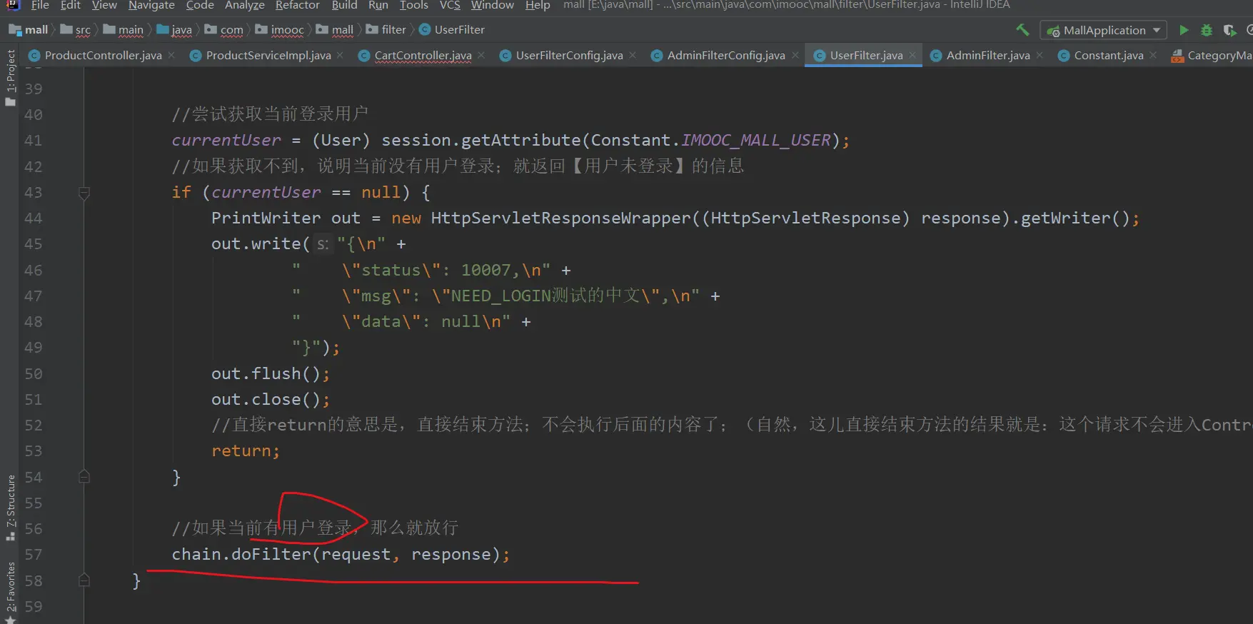 所以,同理,我们这儿也开发一个过滤器,来统一处理这个问题;这样一来,我们在开发【购物车模块】的每个接口时,就不需要再写检查用户登录的逻辑代码了;