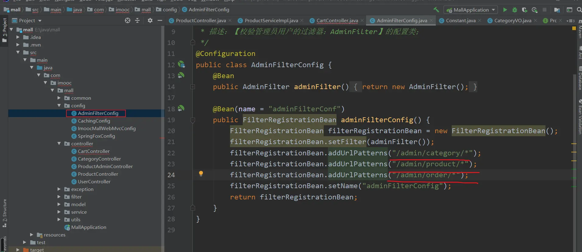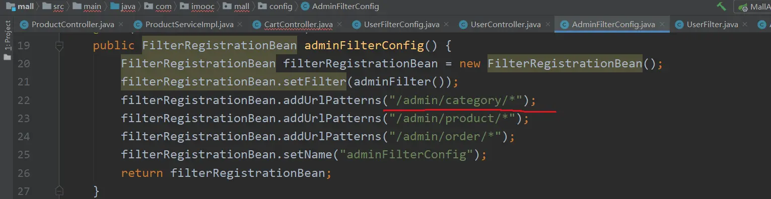 ● 后台有:【增加目录分类】、【更新目录分类】、【删除分类】、【分类列表(平铺)】这4个接口;这4个接口是需要管理员用户登录的;我们在AdminFilterConfig中已经配置了;