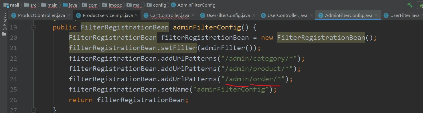 ● 后台有:【订单列表】、【订单发货】这2个接口;这两个接口需要是管理员用户登录,才能够操作;我们在AdminFilterConfig中已经配置了;