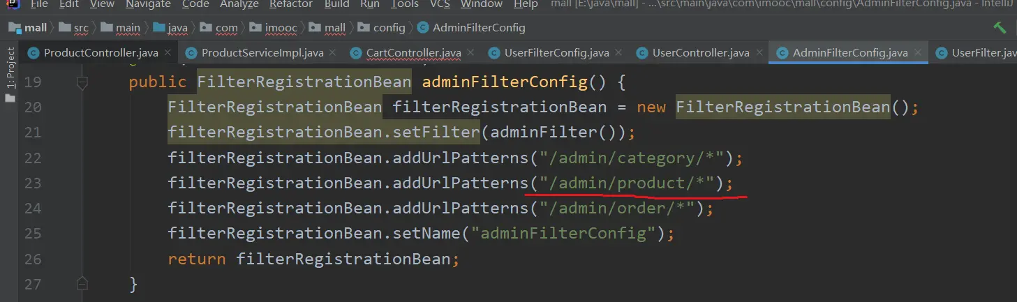 ● 后台有:【增加商品】、【上传图片】、【更新商品】、【删除商品】、【批量上下架商品】、【商品列表(后台)】6个接口;这6个接口是需要管理员用户登录的;我们在AdminFilterConfig中已经配置了;