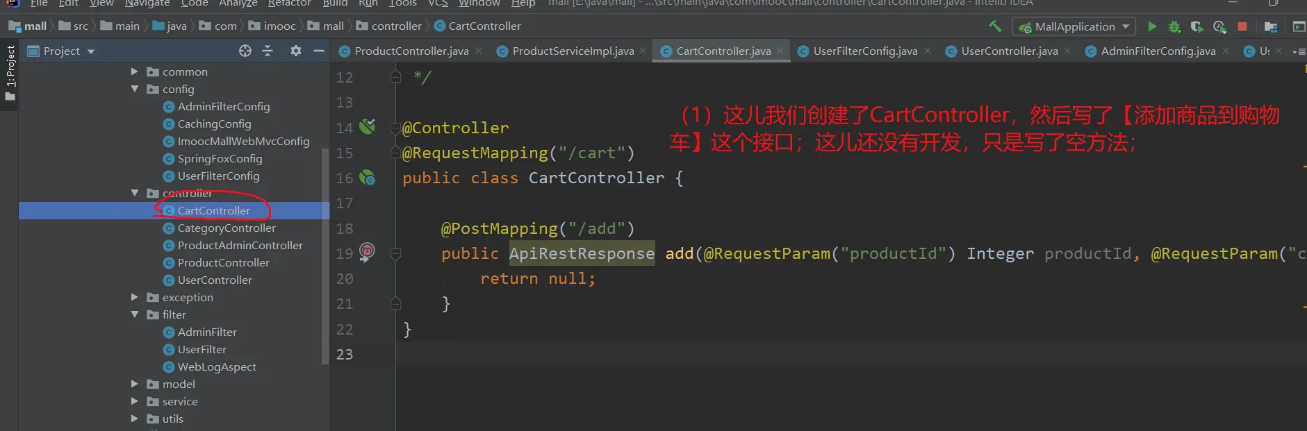 ● 购物车模块的接口都是前台的,有:【购物车列表】、【添加商品到购物车】、【更新购物车某个商品的数量】、【删除购物车的某个商品】、【选中/不选中购物车的某个商品】、【全选/全不选中购物车的商品】6个接口;这6个接口是需要用户登录才能够调用的;(没有区分是普通用户还是管理员用户)对此,我们在UserFilterConfig中进行了处理;