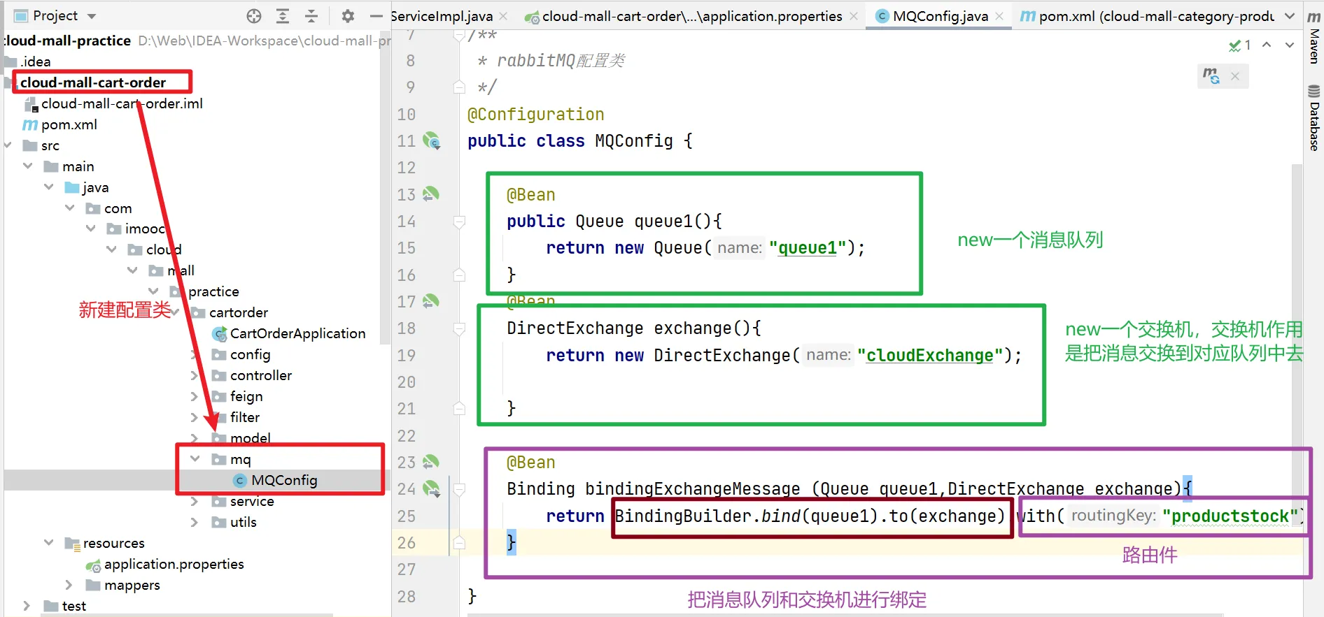return BindingBuilder.bind(queue1).to(exchange).with("productStock");