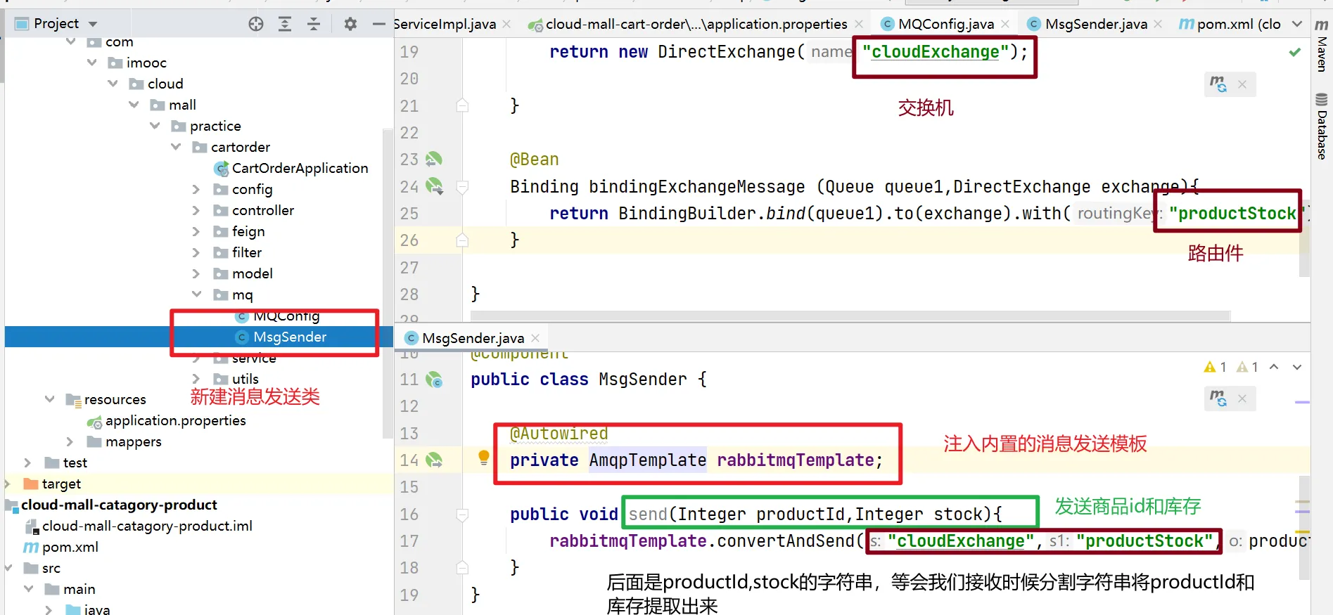 rabbitmqTemplate.convertAndSend("cloudExchange","productStock",productId+","+stock);