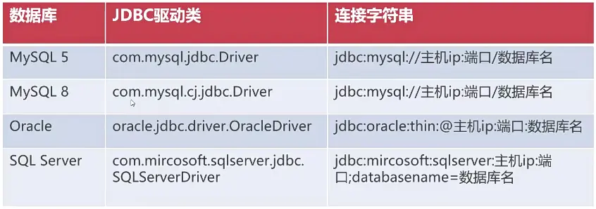 ◆Class.forName用于加载指定的JDBC驱动类 ◆Class.forName本质是通知JDBC注册这个驱动类 ◆驱动由数据库厂商自行开发,连接字符串也不同 数据库存储非常重要,一般需要采购服务器进行存储,所以有对应ip和端口号,所以通过连接字符串进行表达