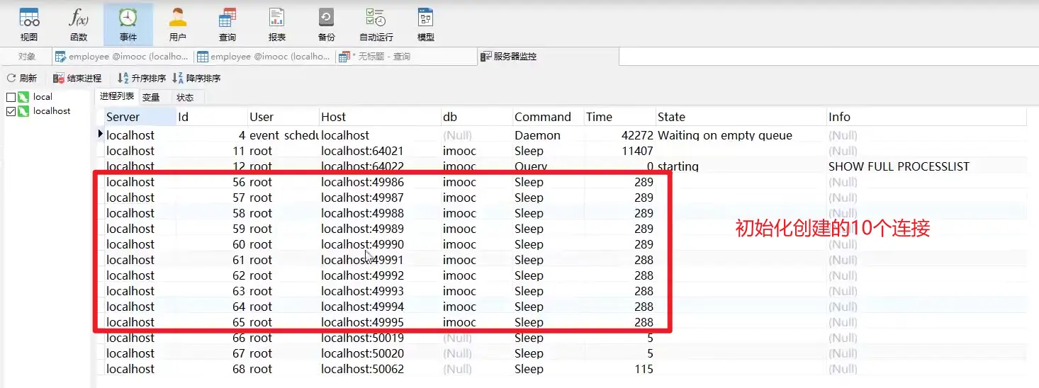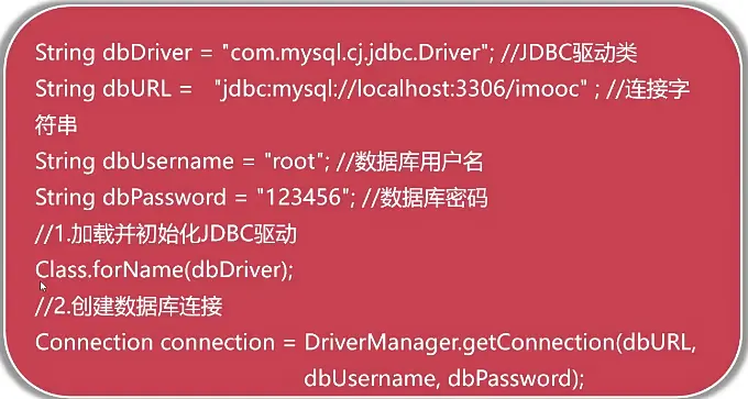 conn = DriverManager.getConnection("jdbc:mysql://localhost:3306/imooc?useSSL=false&useUnicode=true&characterEncoding=UTF-8&serverTimezone=Asia/Shanghai&allowPublicKeyRetrieval=true", "root", "");创建数据库连接代码
