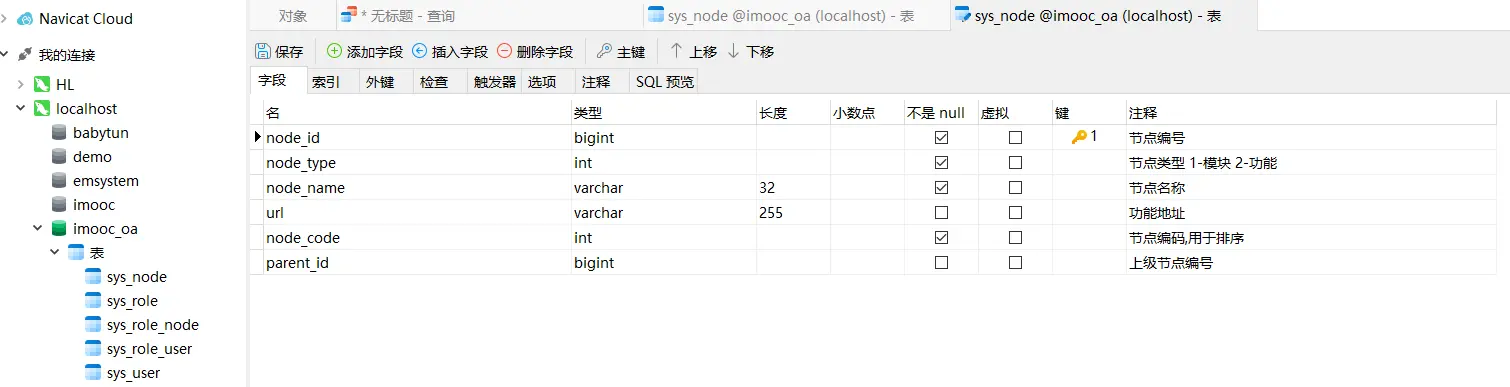 打开navicat数据库,,选择imooc_oa数据库,点击查询,新建查询,将sql文件夹下的sql文件源代码复制粘贴,sql表就创建成功了