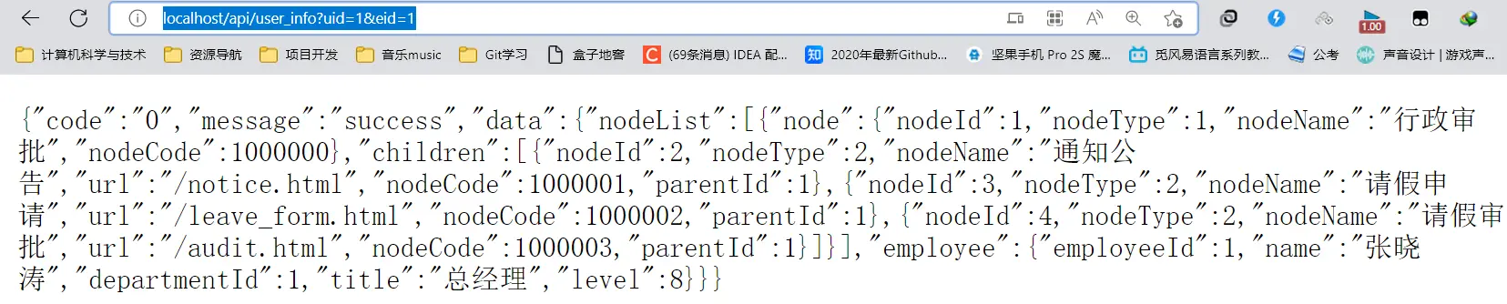 .put("nodeList", treeList).put("employee",employee).toJsonString();这样当前登陆员工获取到了 验证一下localhost/api/user_info?uid=1&eid=1