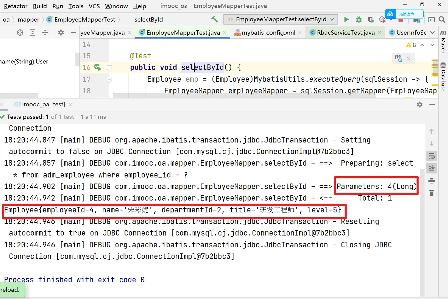 <mapper resource="mappers/employee.xml"/>然后进行测试用例