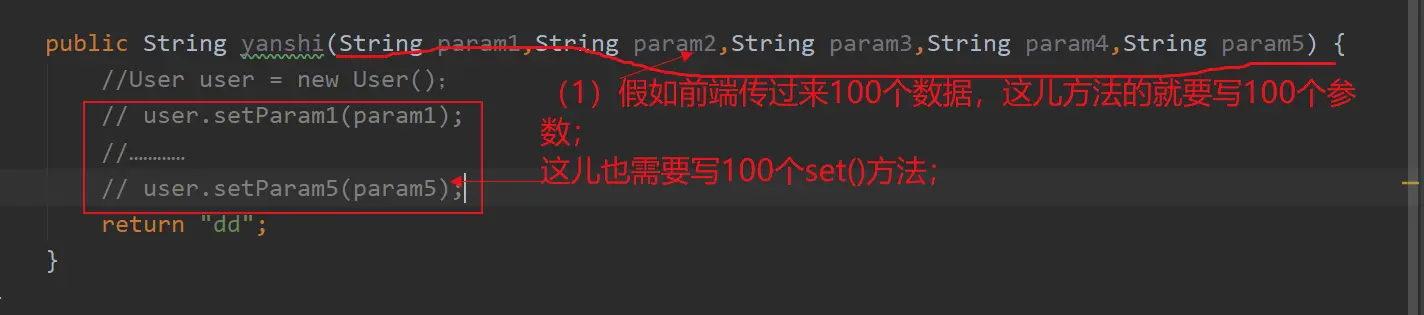 比如前端的表单,有好几十甚至上百个输入项;如果还是采用 【使用【方法参数】接收】中的做法,那么后端Controller方法就会有几十甚至上百个参数,这样会导致方法的参数部分太长,不利于维护;而且,对于这种情况,后端一般使用【Java Bean】去保存,那么就会有大量的set()赋值操作;如下图:很麻烦;