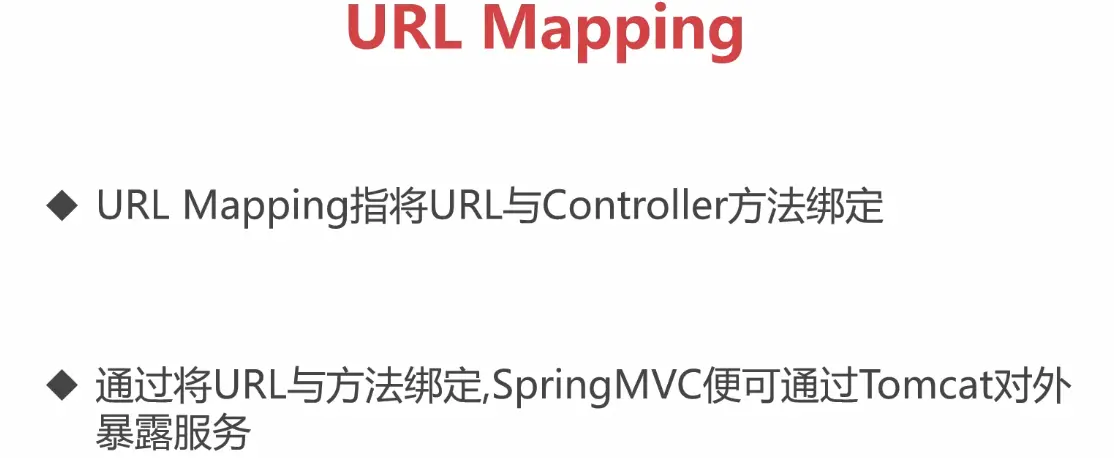 (3)URL Mapping:和J2EE的Servlet类似,Spring MVC中开发的Controller都要与某一个URL进行绑定;