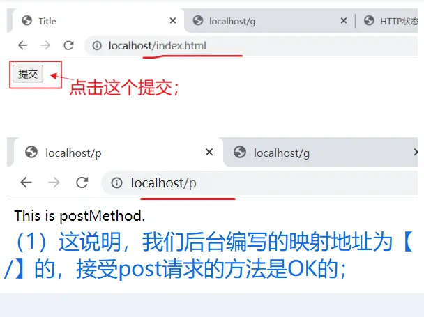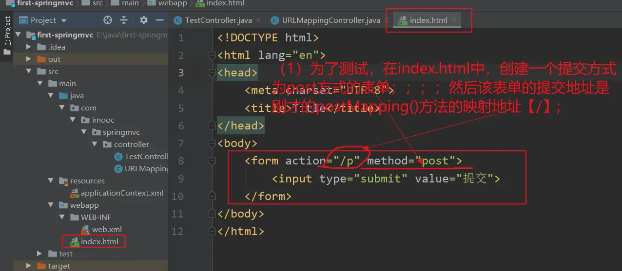 如果想测试postMapping()方法,可以创建一个HTML表单,然后表单提交方式为post方式,如下: