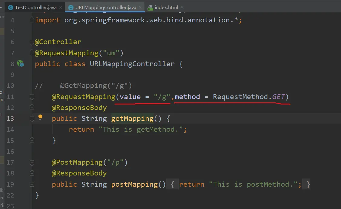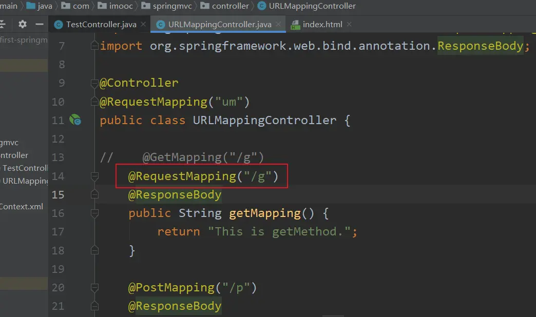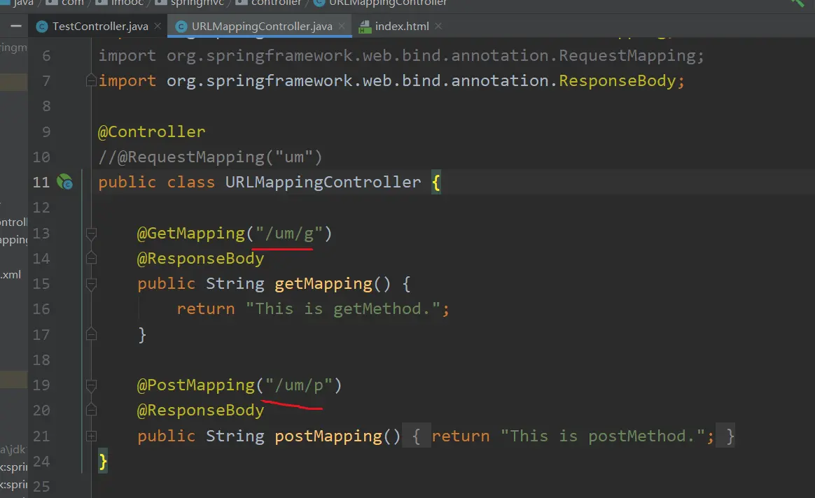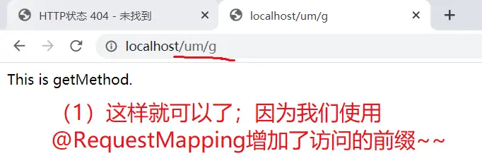 ● 为此,@RequestMapping就派上用场了;如上面代码所示;上面设置以后,URLMappingController类中所有的方法的url都会添加上【/um】前缀了;