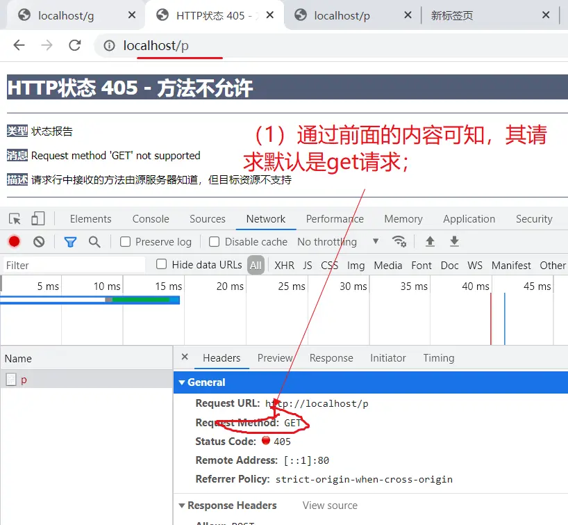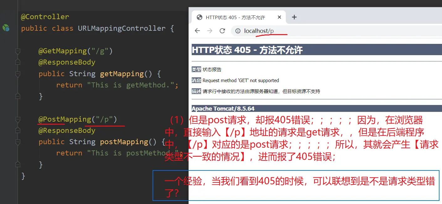 错误原因: 通过浏览器的地址栏输入地址,所访问的URL都是get请求,因此如果以post定义方法,那么由于请求与实现的不一致,会返回405错误,method not allowed, The specified HTTP method is not allowed for the requested resource。这归根到底是因为浏览器发送了get请求,而方法只能处理post请求,所以发生的错误。可以参考下【附加:一般情况下,通过浏览器的地址栏输入url,发送的只能是get请求;(即【哪些情况下会发送get请求】,【哪些情况下会发送post请求】)】