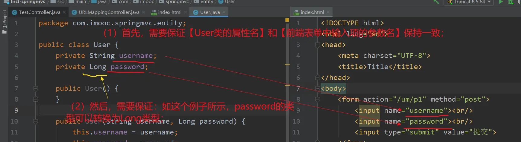 (3) 需要注意的一个点:可以看到,User类的目的是,接收和存储【前端表单提交过来的数据】;因为表单中参数都是如【username,password这种未采用驼峰的书写方式】,所以User类的属性也是【username,password这种未采用驼峰的书写方式】;