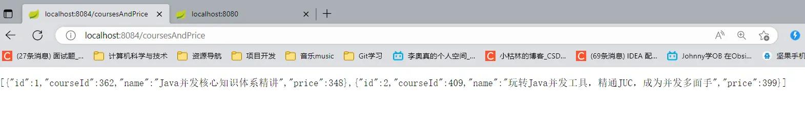 浏览器访问: 我们配置的是8084端口 localhost:8084/coursesAndPrice